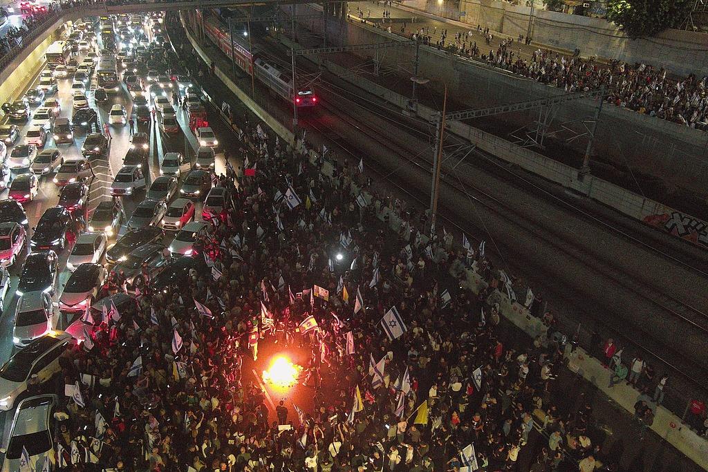 △当地时间11月5日,以色列特拉维夫,大量人群聚集在高速公路上,封堵交通。