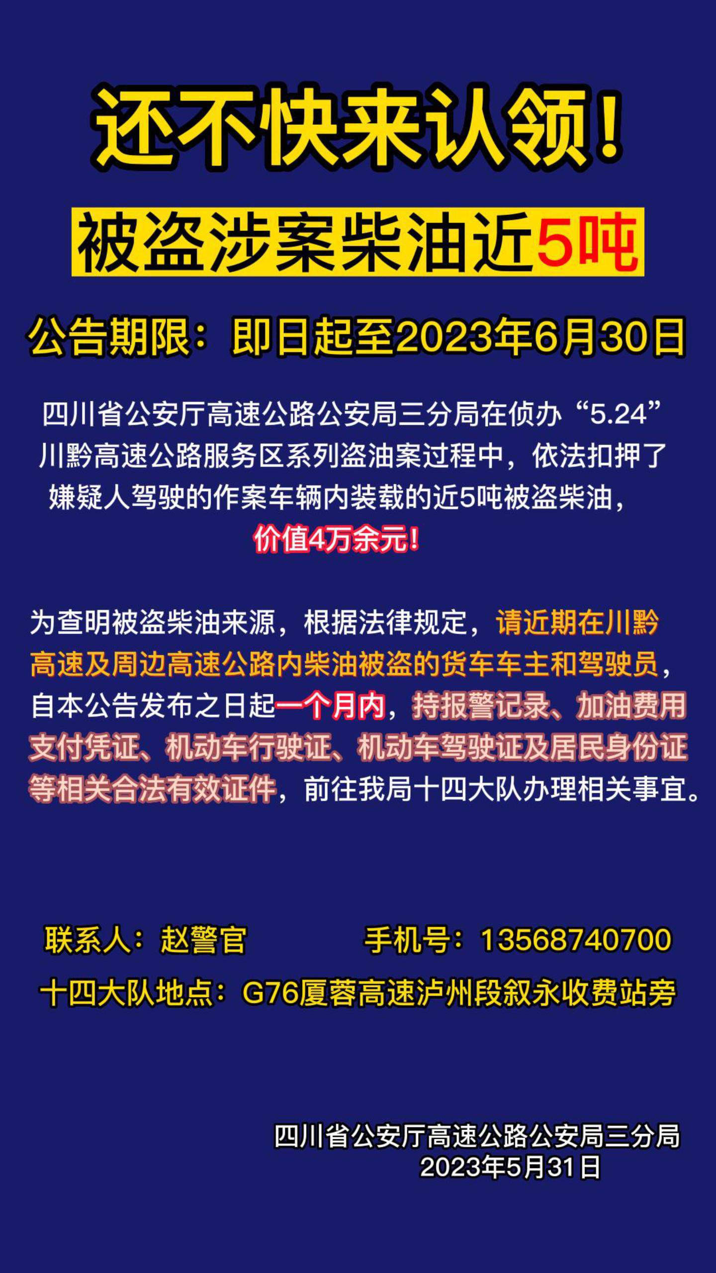 为查明被盗柴油来源,根据法律规定,请近期在川黔高速及周边高速公路内柴油被盗的货车车主和驾驶员,自本公告发布之日起一个月内,持报警记录、加油费用支付凭证、机动车行驶证、机动车驾驶证及居民身份证等相关合法有效证件,前往四川省公安厅高速公路公安局三分局十四大队办理相关事宜。