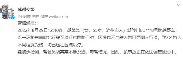 8月29日,成都交警发布通报称,胡某某(女,55岁,泸州市人)驾驶川EU***8号牌越野车,沿成都市青羊区一环路由南向北行驶至清江东路路口时,因操作不当驶入路口西侧人行道,致3名路人不同程度受伤,均已送往医院治疗。