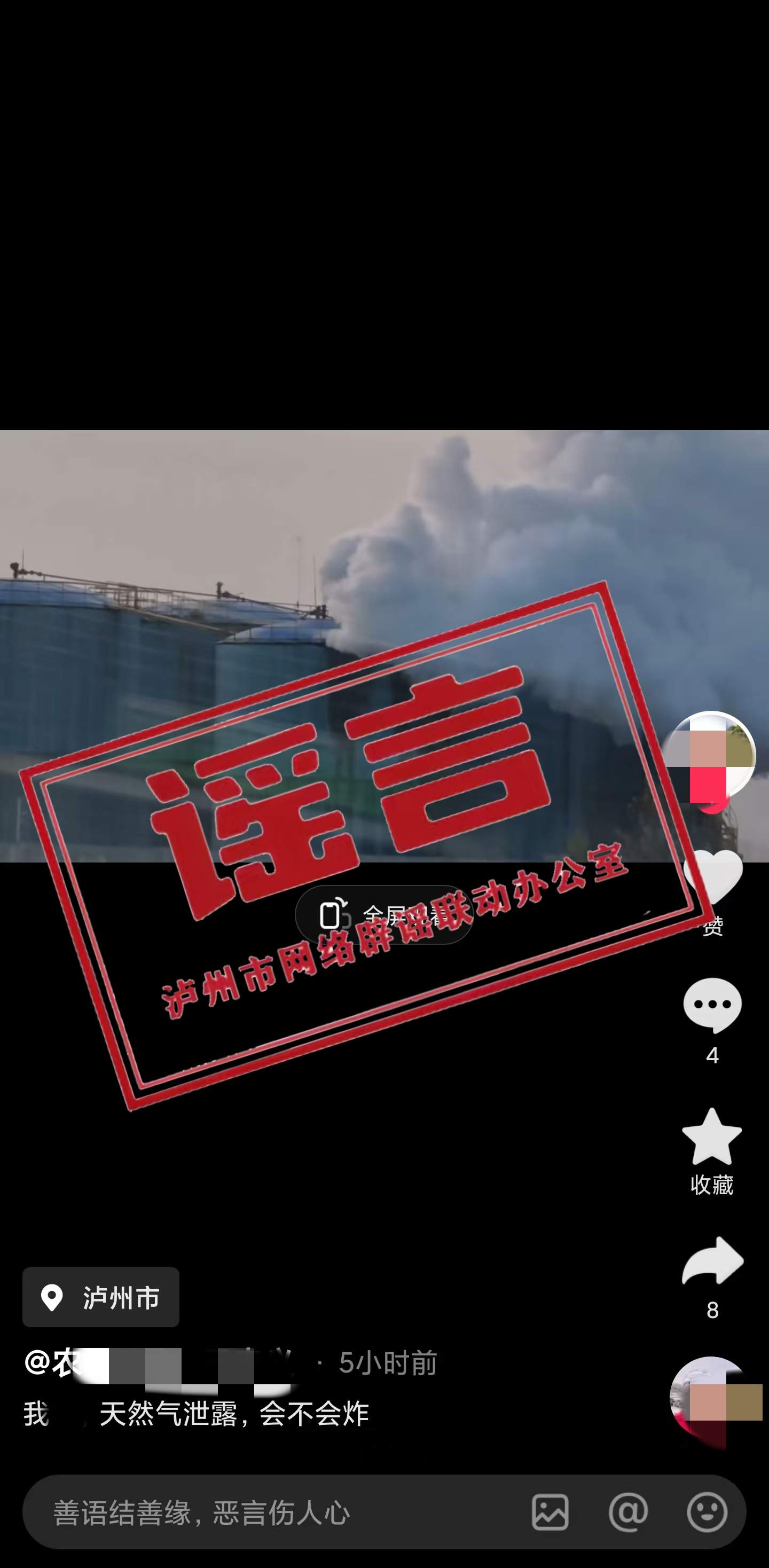 11月17日,有网友通过短视频平台发布视频,配文称“天然气泄漏,会不会炸”,并定位“泸州市”。
