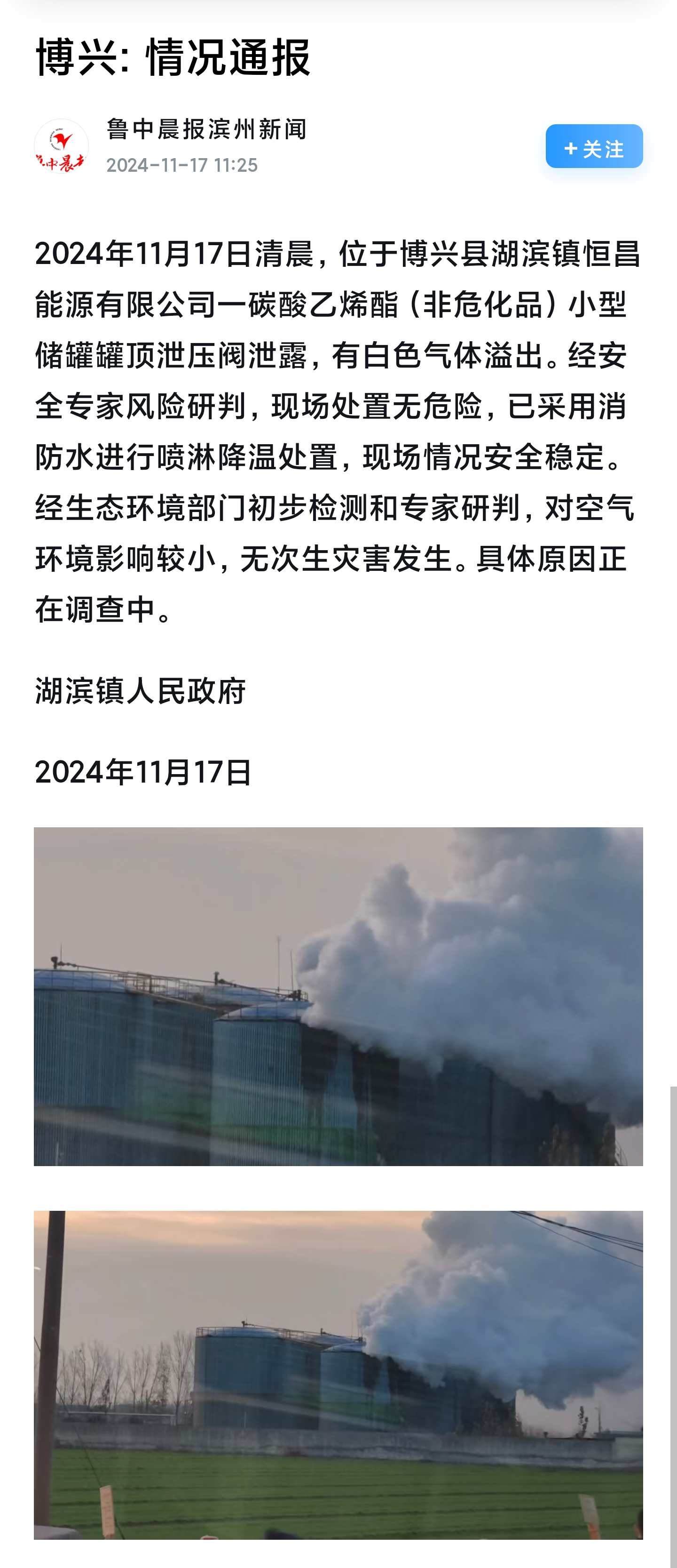 经多部门核实,截至11月17日13时,泸州辖区内未发生天然气储存罐泄漏事件,该视频疑为山东省某地于2024年11月17日清晨发生的一起碳酸乙烯酯泄漏事件。请各位网友不信谣,不传谣。