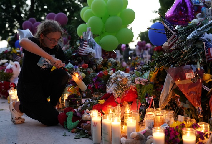 2022年5月28日,在美国得克萨斯州南部尤瓦尔迪市的城市广场,市民哀悼枪击事件遇害者。尤瓦尔迪市5月24日发生恶性校园枪击事件,造成至少19名儿童和2名教师死亡。这是美国近十年来遇害人数最多的一起校园枪击事件。新华社记者 吴晓凌 摄