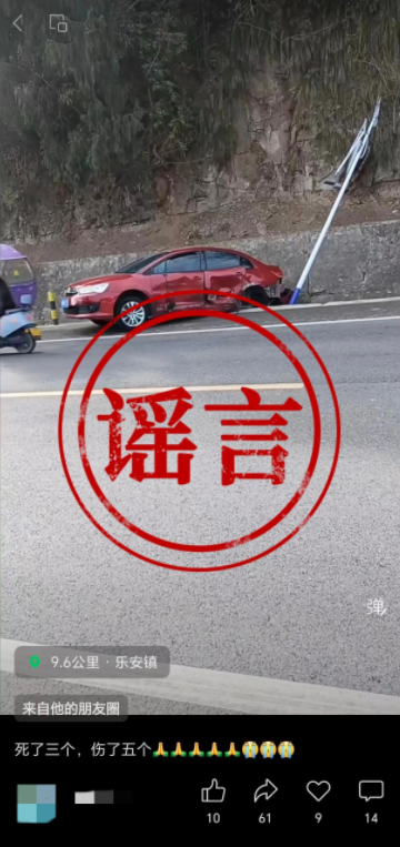 成都籍男子郑某某路过三台县乐安镇地界时,拍摄一段当地道路一起普通交通事故视频,并在某视频平台发布,配文造谣“死了三个,伤了五个”,该视频被不明真相网友转发、评论,该行为涉嫌故意虚构事实扰乱公共秩序。根据《中华人民共和国治安管理处罚法》第二十九条第一项的规定,三台县公安机关依法对郑某某作出行政处罚。