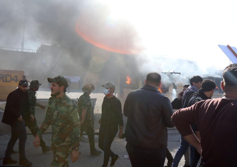 这是2019年12月31日在伊拉克巴格达美国驻伊拉克大使馆外拍摄的示威者点燃一间保安室。据伊拉克内政部消息,数百名示威者在美国驻伊拉克大使馆前集会,抗议美军空袭伊拉克。新华社发(哈利勒·达伍德摄)