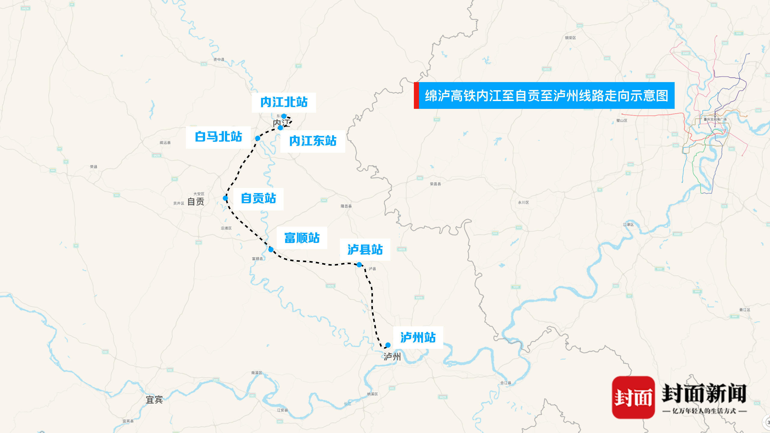 绵泸高铁内自泸段位于四川省南部地区,北起内江市成渝城际铁路内江北站,向南经白马镇进入自贡市境内,再经富顺县进入泸州市境内,线路全长128公里,设内江北(既有)、内江东、白马北、自贡、富顺、泸县、泸州7座车站,运营时速250公里。