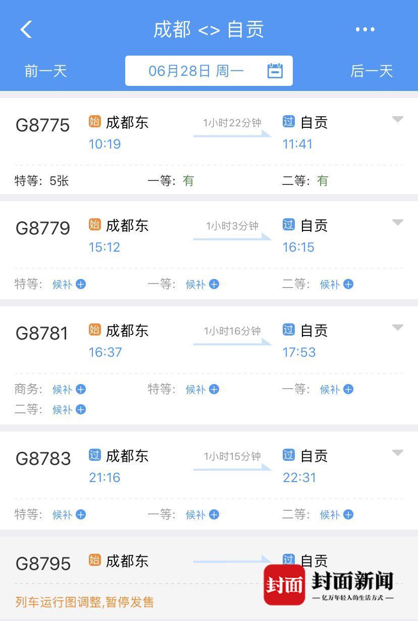 6月27日上午11点过,铁路12306官方售票渠道开始发售绵泸高铁内自泸段动车票。根据票务信息,全线将于6月28日开通运营,川南自贡、泸州将正式开启“高铁时代”。