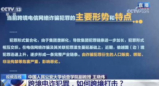中国人民公安大学侦查学院副教授 王晓伟:这样一种变化,一方面显示了诈骗的技术性越来越高,诈骗分子也在不断寻求更为精准、更为高效的诈骗方式。另外一方面也显露出目前电信网络诈骗犯罪,正逐渐在走向全球化,全球各国的民众都有更多可能受到电信网络诈骗犯罪的侵害。从提醒的角度,一方面我们每个人都要不断加强自己的防骗意识。另外一方面,对于这些已经参加到,或者是想要参加到电信网络诈骗团伙当中的高学历、高层次的人才来讲,一定要认清形势。虽然可能通过这种方式在短期之内获得一定的财富,但是从长远看,一旦踏出这一步就没有回头路了。