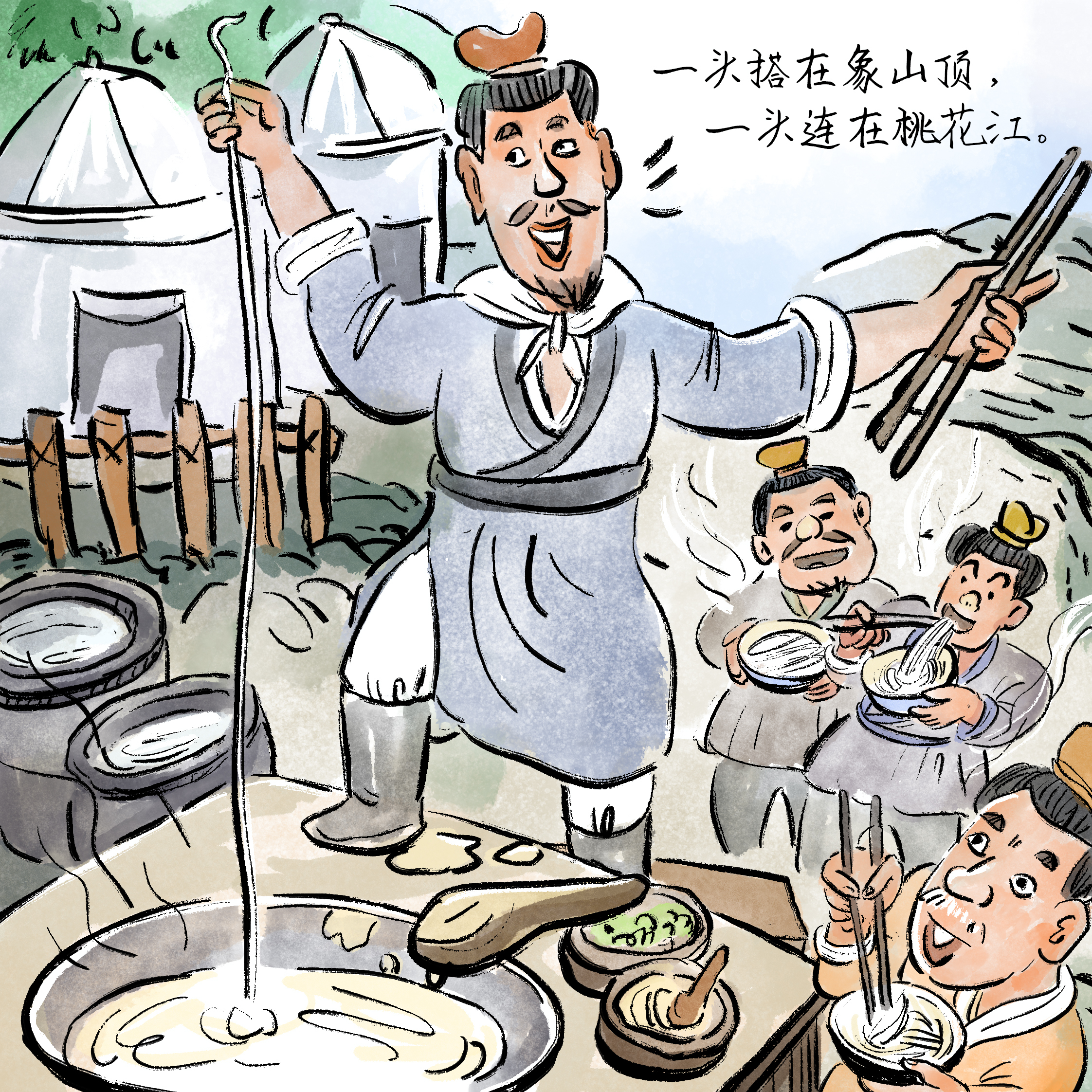 刘璋就说:“闻此山中一人家,其妇善烹饪,祖传以大米磨浆,制成丝,辅以鸡鱼肉等自制作料,开水烫熟即食,汤鲜味美,百里名盛。”于是,刘璋命令手下将这名主妇叫上山来做了这道奇妙的菜。