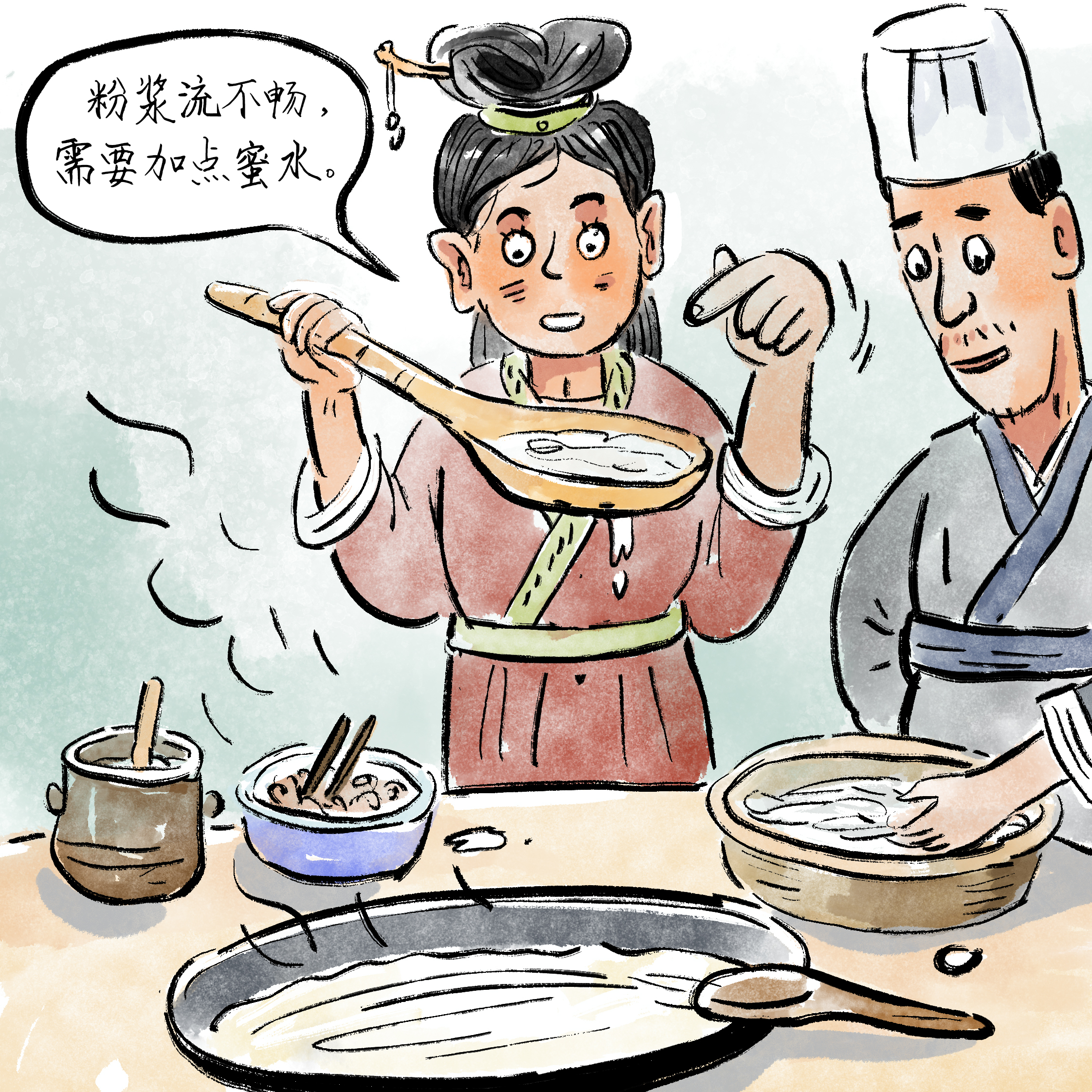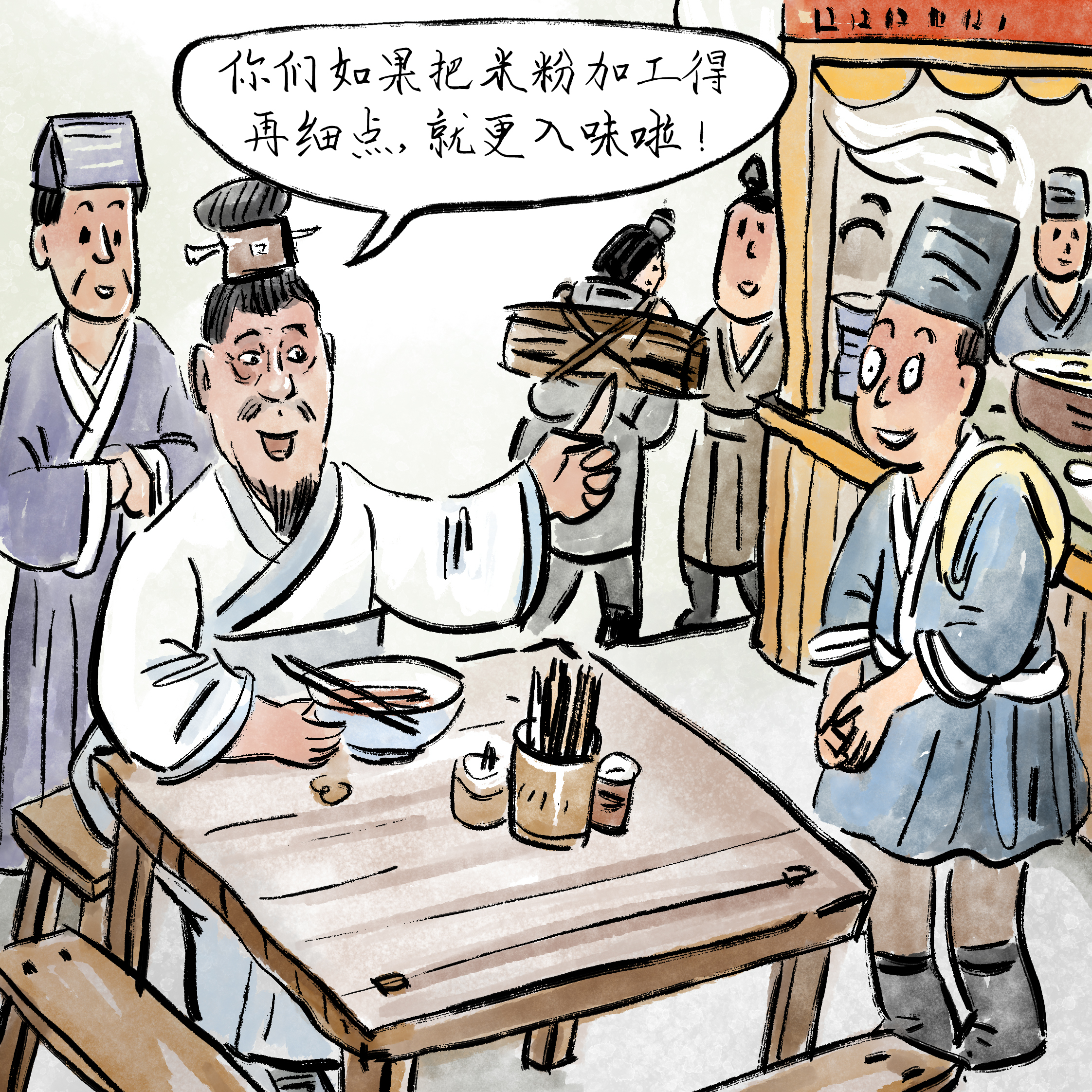 在人口迁移过程中,这一烹饪技术被带往江南一带,江南先民们改用当地的大米来制作米粉,同时改进了工艺,做法是用上等精致的白米磨粉后,用蜜和水调至稀稠适中,灌入底部钻有孔的竹勺中,看粉浆能不能通过勺孔流出,若不能,再加蜜和水调和,直到流出来成细线, 入锅中以膏油煮熟。这一番“精细化操作”使米粉的质量和口感都有很大提升,而做出的米粉则被叫作“粲”,在古代汉语中,“粲”有优质大米之意。