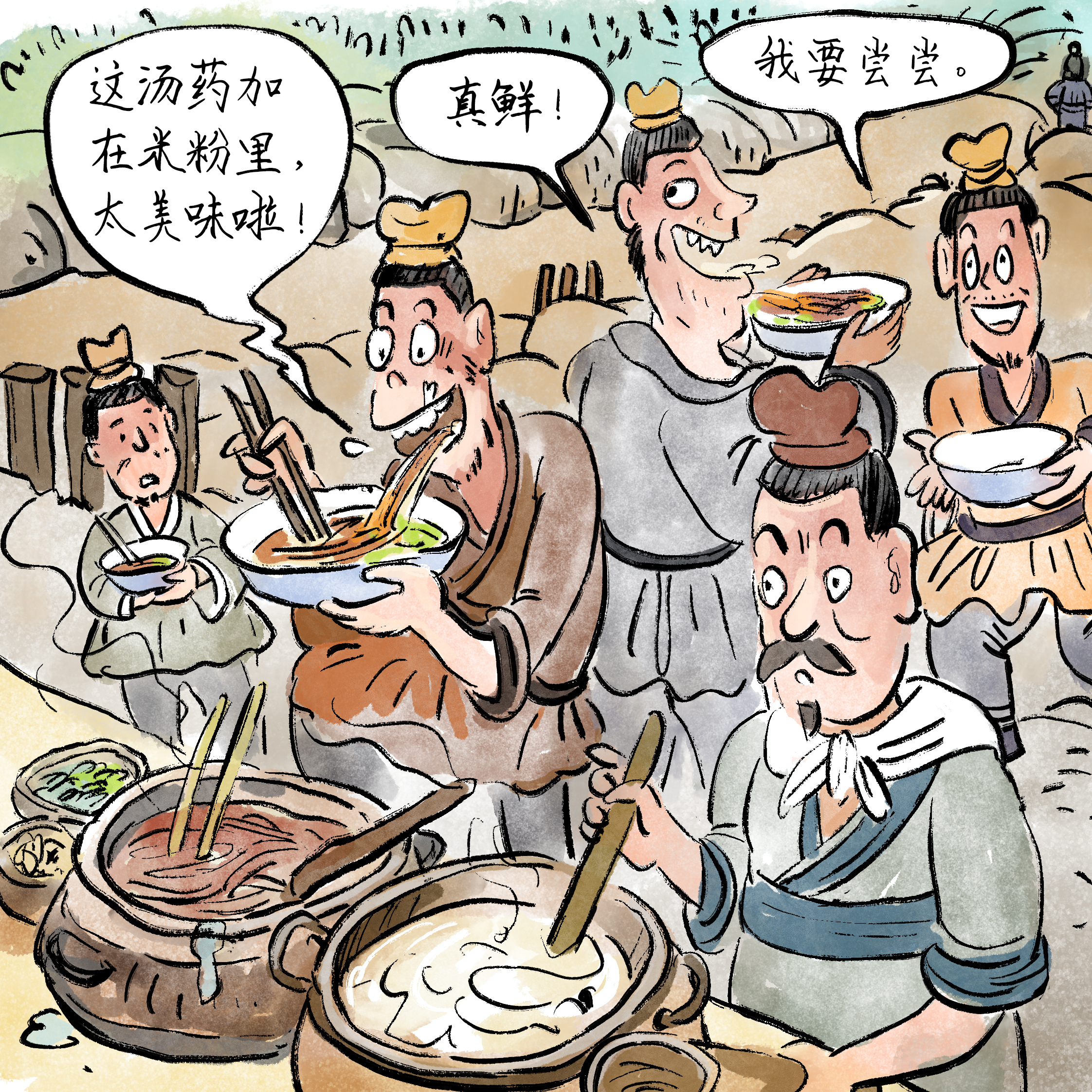 一次,由于施工紧张,一人将药汤与米线混合在一起,三口两口就扒完了。没想到味道还不错!很快,几万名开挖灵渠的兵士们也这样吃,这一方法在军中扩散开来,成为如今一些地区米粉所用卤水的雏形。