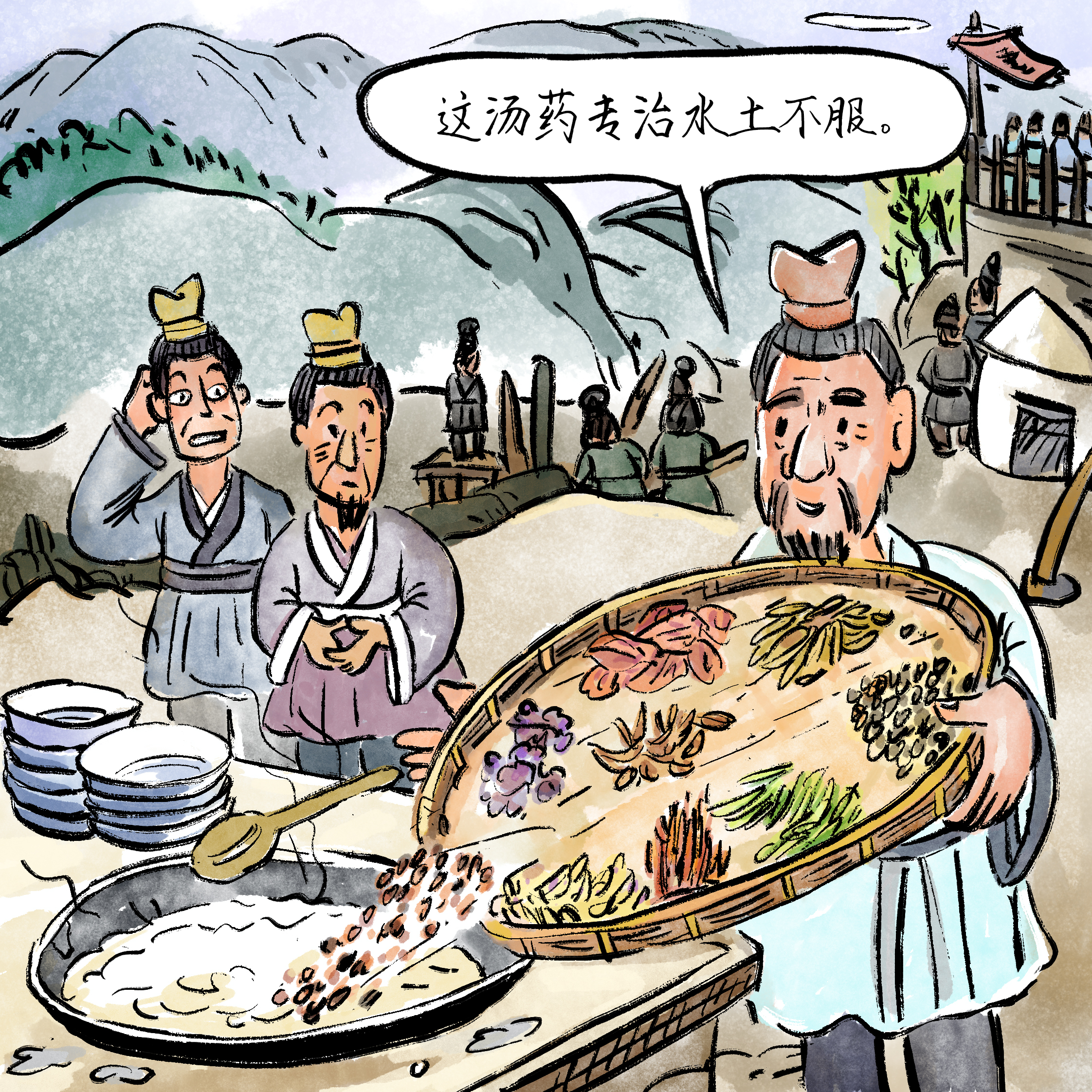 米粉制作成功后,兵士们吃饭就有了“嗦面”的感觉,但水土不服的问题依然存在。于是,军中郎中寻访当地求取药方,有一老农推荐了罗汉果、草果、茴香、花椒、陈皮、槟榔、桂皮、丁香、桂枝、胡椒、香叶、甘草、沙姜、八角等草药,郎中将其采集熬成药汤让将士们服用,水土不服很快得到缓解。
