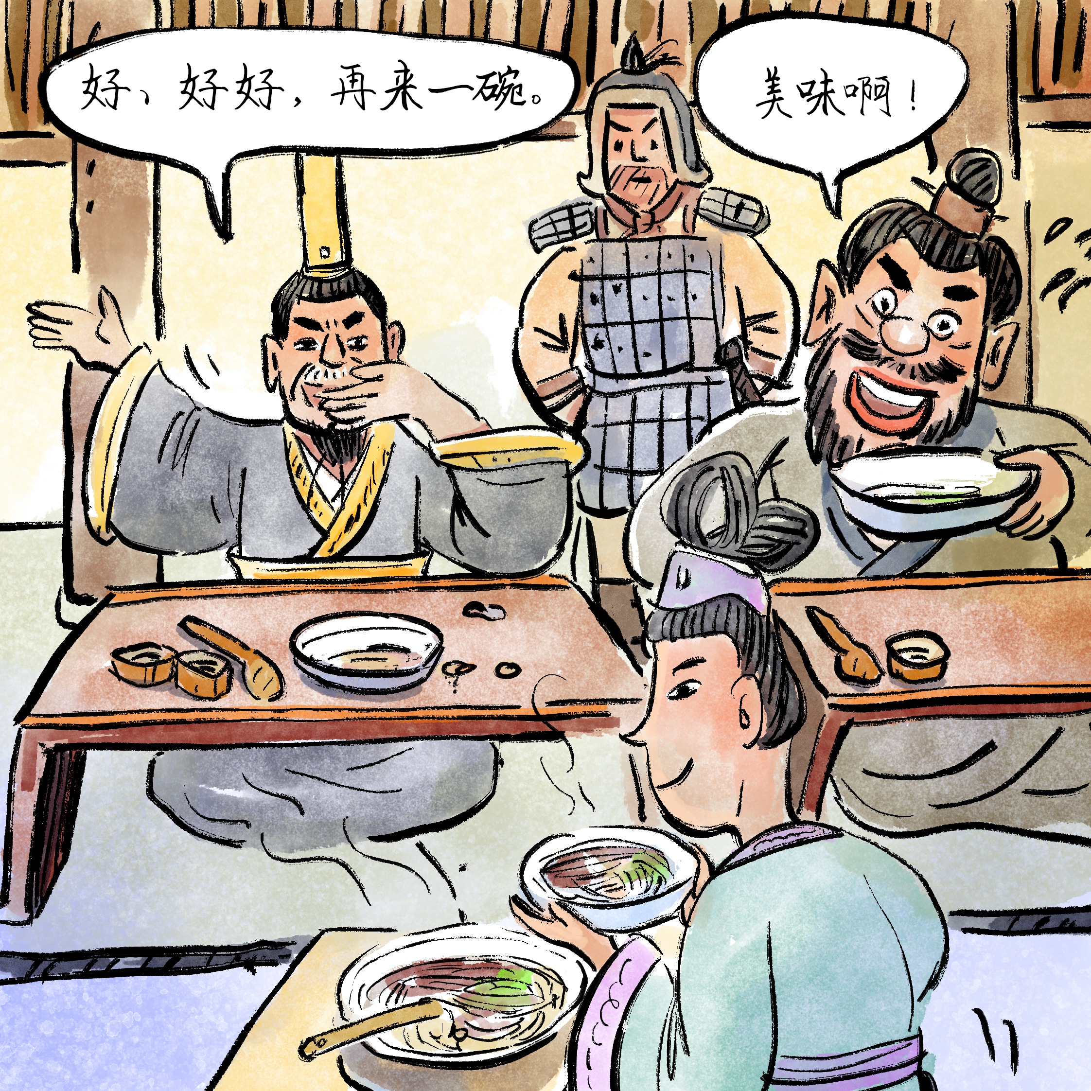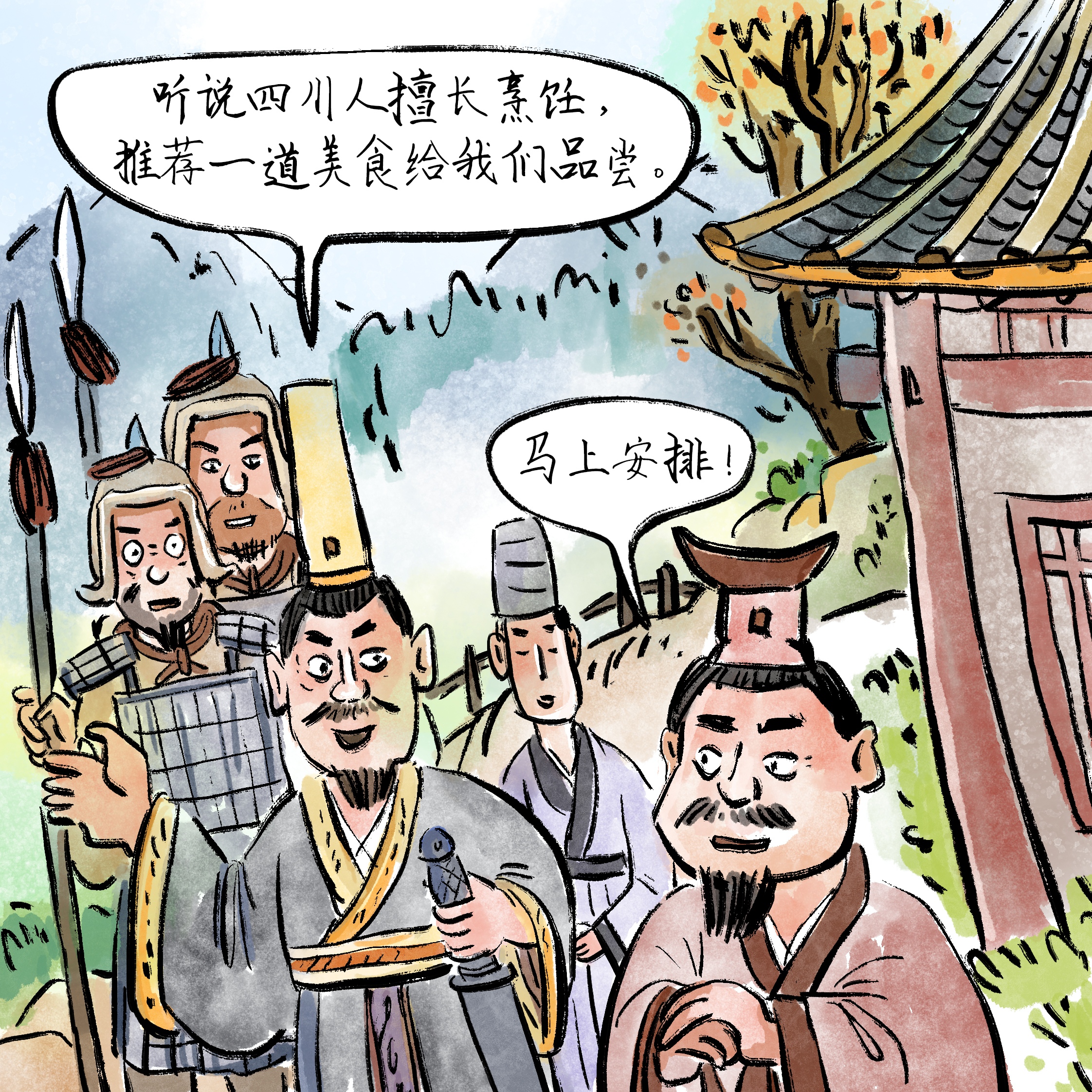 还没上桌,刘备及众将就闻到一股香辣的味道。一会儿工夫就吃了个精光。吃完饭,刘备顿时来了精神,手下众将一个个也都神采奕奕。再看上下,水肥稻丰、牧笛声声。刘备禁不住抚掌感慨:“富哉,今日之乐乎,美味也!”后来,四川民间争相仿制。在绵阳,在大街小巷,街道两旁米粉店都是清香扑鼻。