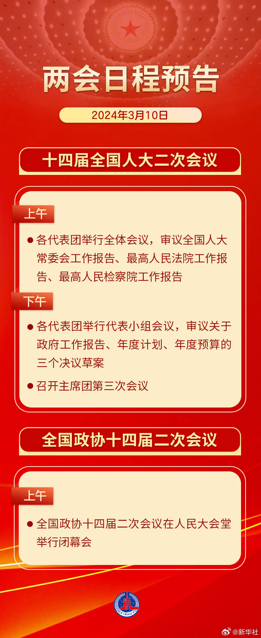 两会日程预告|全国政协十四届二次会议闭幕 新华社 2024-03-10 07:13 92081 3月10日,人代会审议全国人大常委会工作报告等;全国政协十四届二次会议闭幕。 评论 68 追老虎的猫 2024-03-10 发表于四川 迎着春风 乘势而上 小蜻蜓呀 2024-03-10 发表于四川 新时代新征程,继续向前! 何天天 2024-03-10 发表于四川 展望未来,凝心聚力谋发展 查看更多