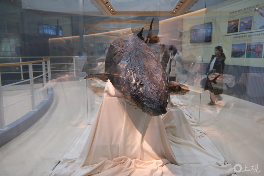 水野中心内科普馆的“镇馆之宝”,是一尾中华鲟标本。它长3.5米,重350公斤。2007年7月17日在金山区杭州湾水域误入渔网受伤,经全力救治成功存活1232天,在2010年12月1日死亡,创下当时国内抢救救治中华鲟最长存活纪录 郜阳 摄