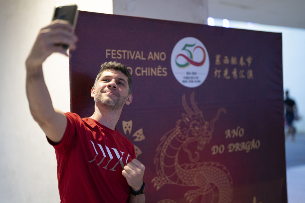 2月3日,在巴西累西腓,一名男子在中国巴西建交50周年纪念标识前拍照留念。中国春节庆祝活动3日在巴西东北部城市累西腓的林度夫人公园举行。 新华社记者王天聪摄