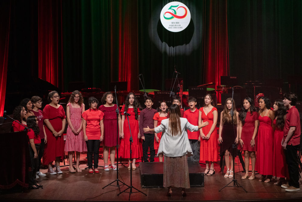 6月3日,在巴西北里奥格兰德州纳塔尔举行的“庆祝中国巴西建交50周年——巴西东北部中巴音乐巡演(纳塔尔场)”音乐会上,北里奥格兰德联邦大学的戚楠老师指挥巴西小朋友们合唱《茉莉花》。 新华社记者王天聪摄