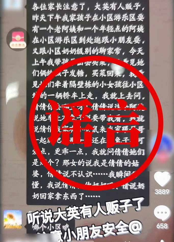 2022年11月,遂宁大英县各微信群内流传有人贩子拐小孩的言论,聊天内容被传播至多个学生家长群,引发大量关注。经核实,该消息系不实信息,系违法行为人曾某自行编造不实内容在微信群中发布,造成不良社会影响。大英县公安机关已依法对曾某予以行政处罚。