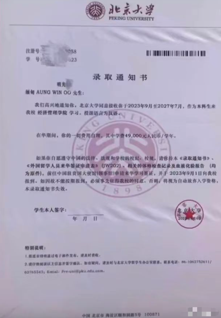 上游新闻记者从网传“北京大学录取通知书”截图看到:“缅甸明光忠,我们高兴地通知你,北京大学同意接受你于2023年9月至2027年7月,作为本科生来我校经济管理学院学习,授课语言为汉语……”另外,还有多张明学昌与明光忠在“升学宴”上的庆祝图片。