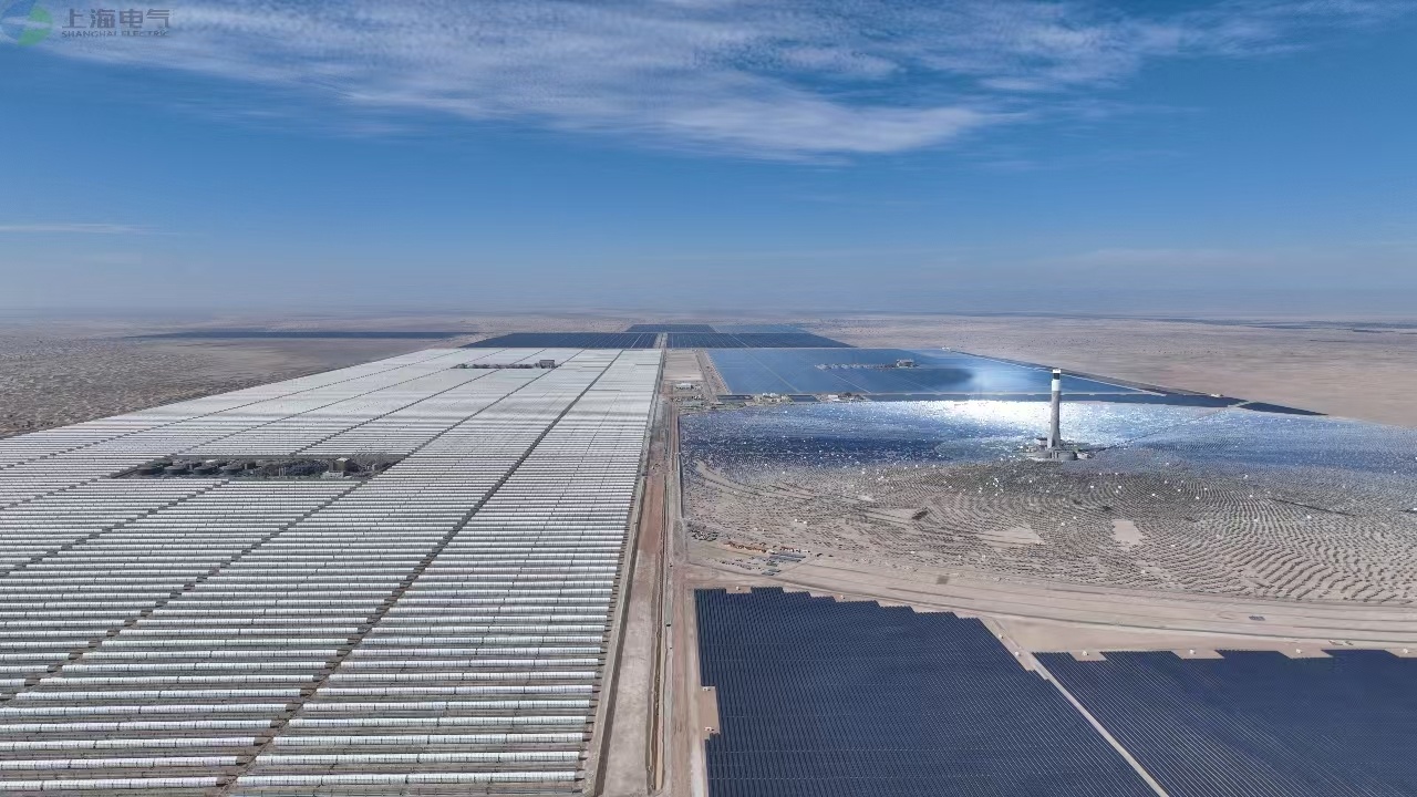 在阿拉伯联合酋长国迪拜的沙漠深处,一片蔚蓝的光伏板“海洋”在烈日下熠熠生辉:巍然耸立的262米集热塔与周围约7万面定日镜组成的巨大镜场,共同构成全球规模最大的光热光伏复合电站。6000多套槽式集热器在相当于6000多个标准足球场面积的园区中协同运作,捕捉沙漠中充沛的太阳能,并将其源源不断转化为清洁电能。