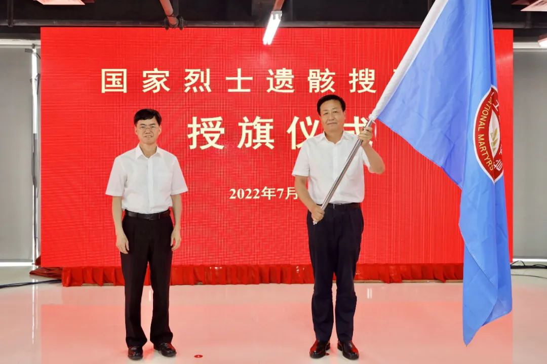 7月20日,国家烈士遗骸搜寻队及国家烈士遗骸DNA鉴定实验室成立仪式在京举行。图为退役军人事务部党组书记、部长裴金佳为国家烈士遗骸搜寻队授旗。图片来源:退役军人事务部