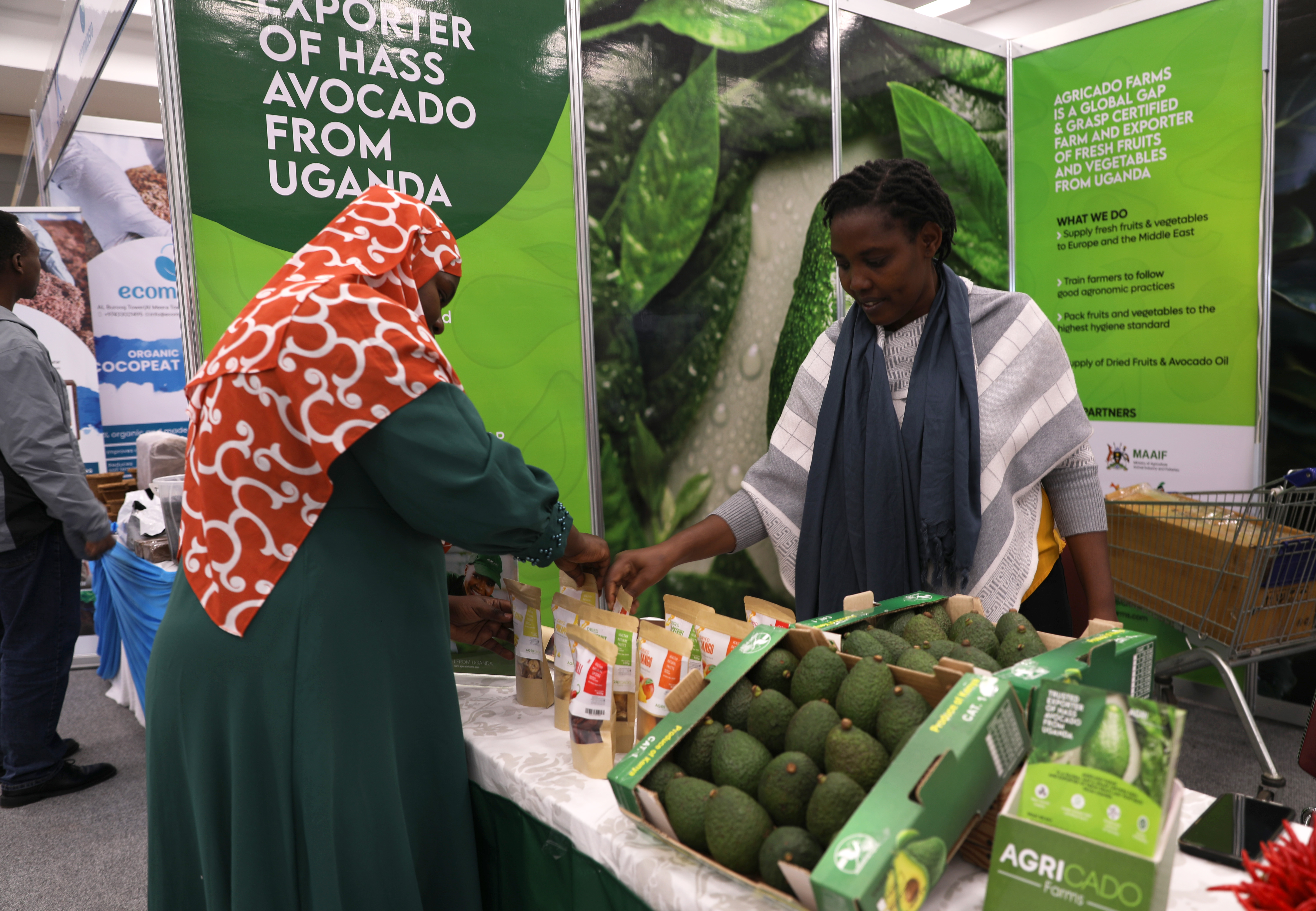 5月31日,参展商在肯尼亚内罗毕举行的第二届国际非洲牛油果大会上向参观者介绍产品。新华社记者董江辉摄