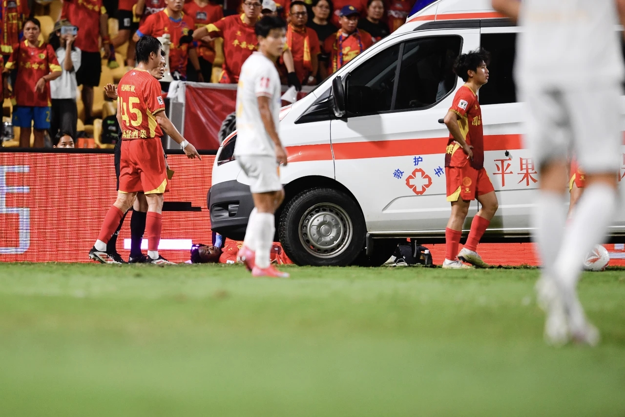 随后,平果球员黄威在拼抢中又与铜梁龙球员对抗后受伤倒地。救护车再次入场将黄威送往医院。