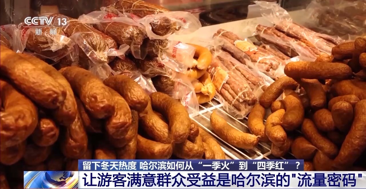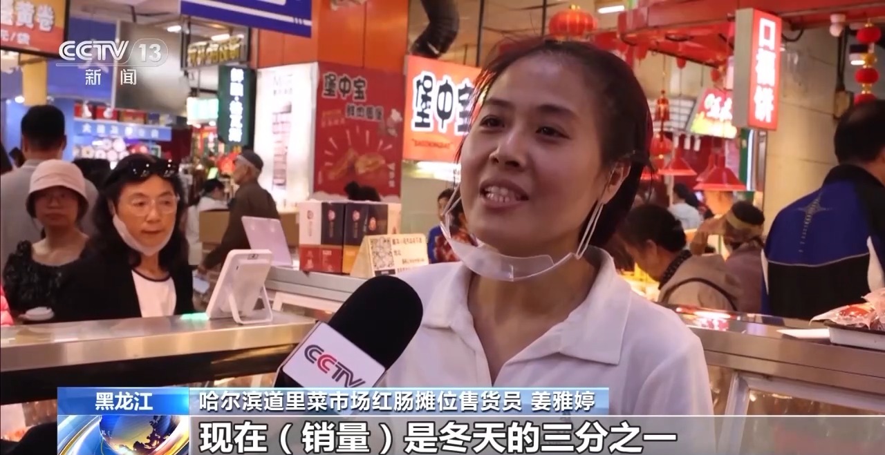 哈尔滨道里菜市场红肠摊位售货员 姜雅婷:现在销量是冬天的三分之一,但是现在客流也不断,仍然有很多外地游客专门买哈尔滨红肠。