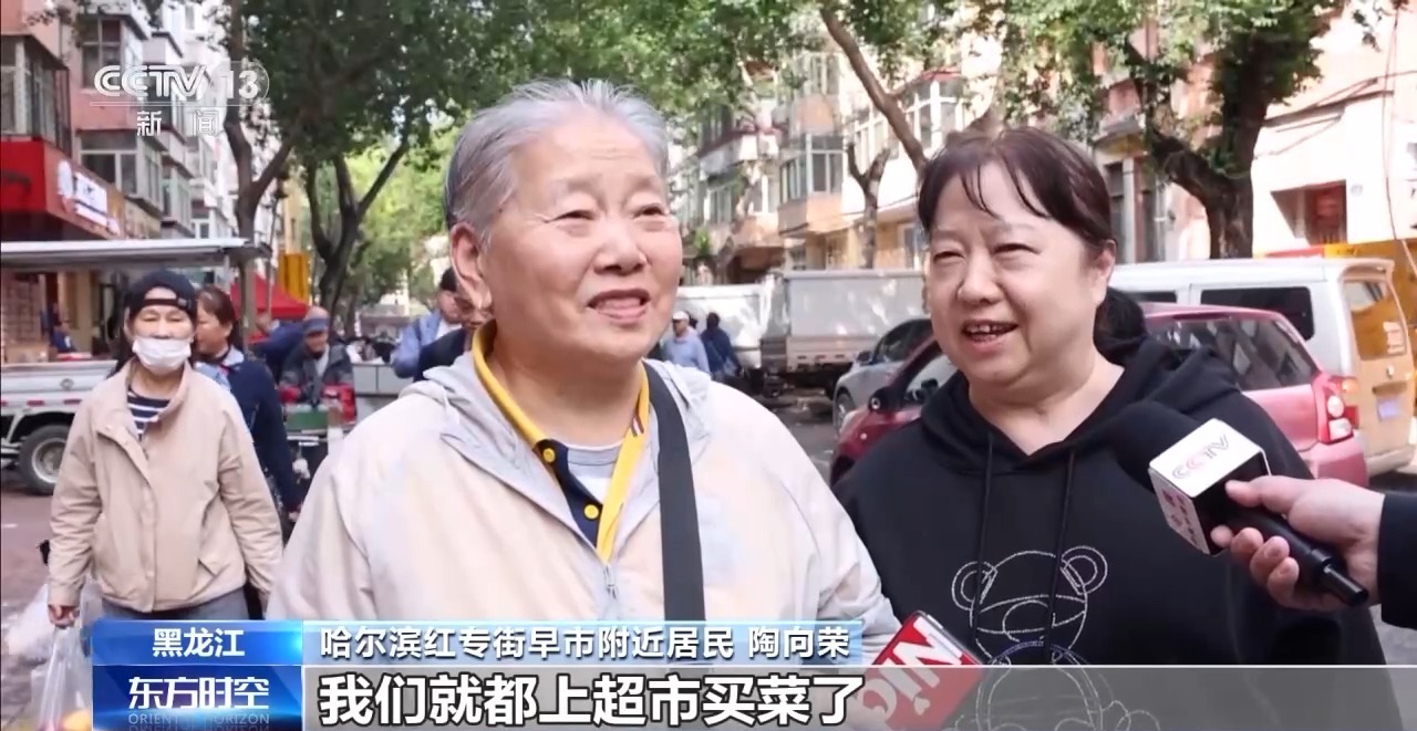 哈尔滨红专街早市附近居民 陶向荣:冬天人都走不过来,全是人,我们就都上超市买菜,就不上早市了,给他们(游客)让出地。现在人少了,我们就出来买菜,溜达溜达。