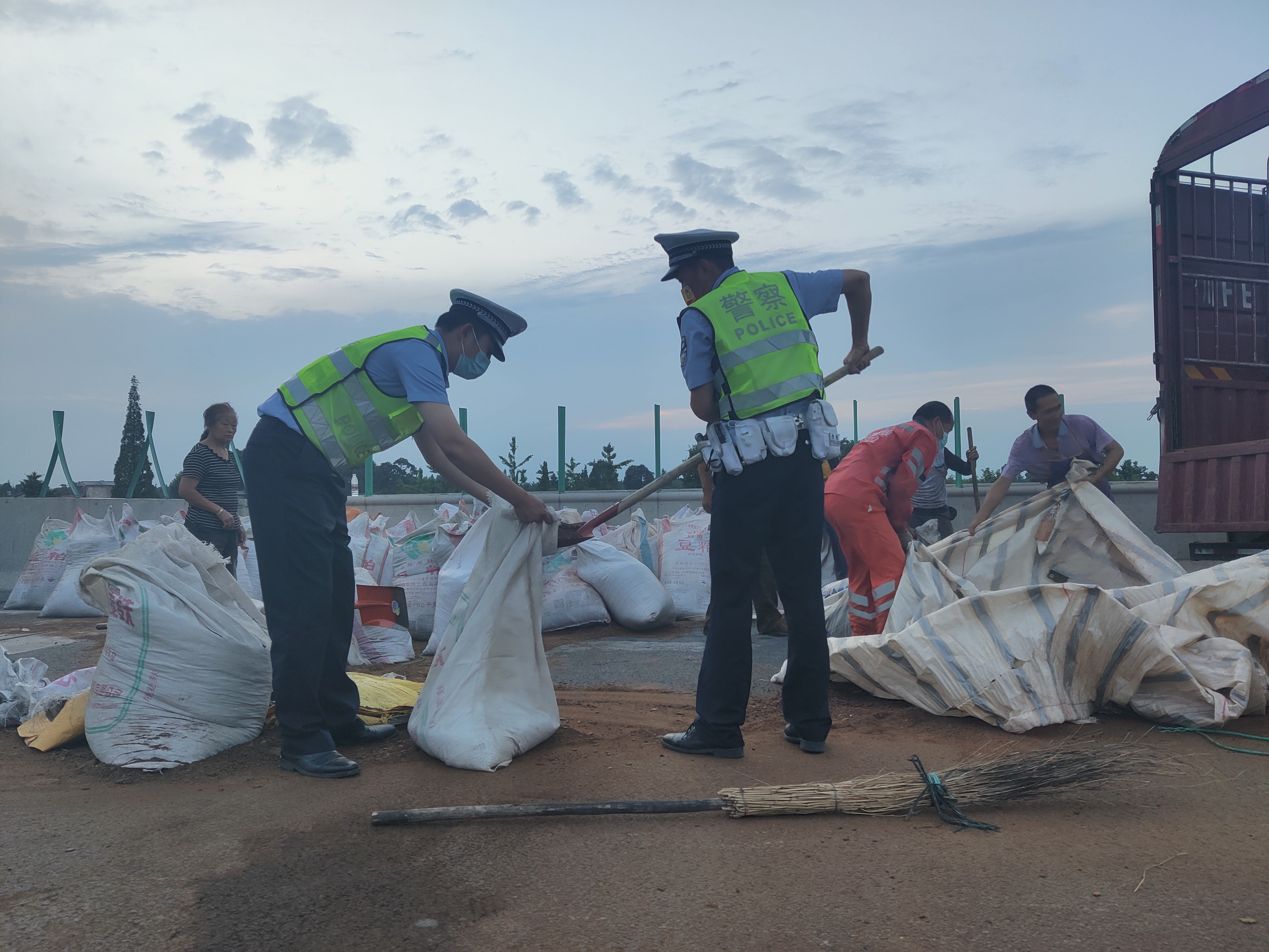 与此同时,民警协调吊车、拖车、转运车,联合路政、养护等部门进行紧急处置。因侧翻货物多,加之运输货物是菜油渣,现场清扫难度大,为尽快恢复交通,转运车辆到达后,现场执勤民警化身搬运工和清洁工,与车主和施救人员一起来回搬运、清扫货物。