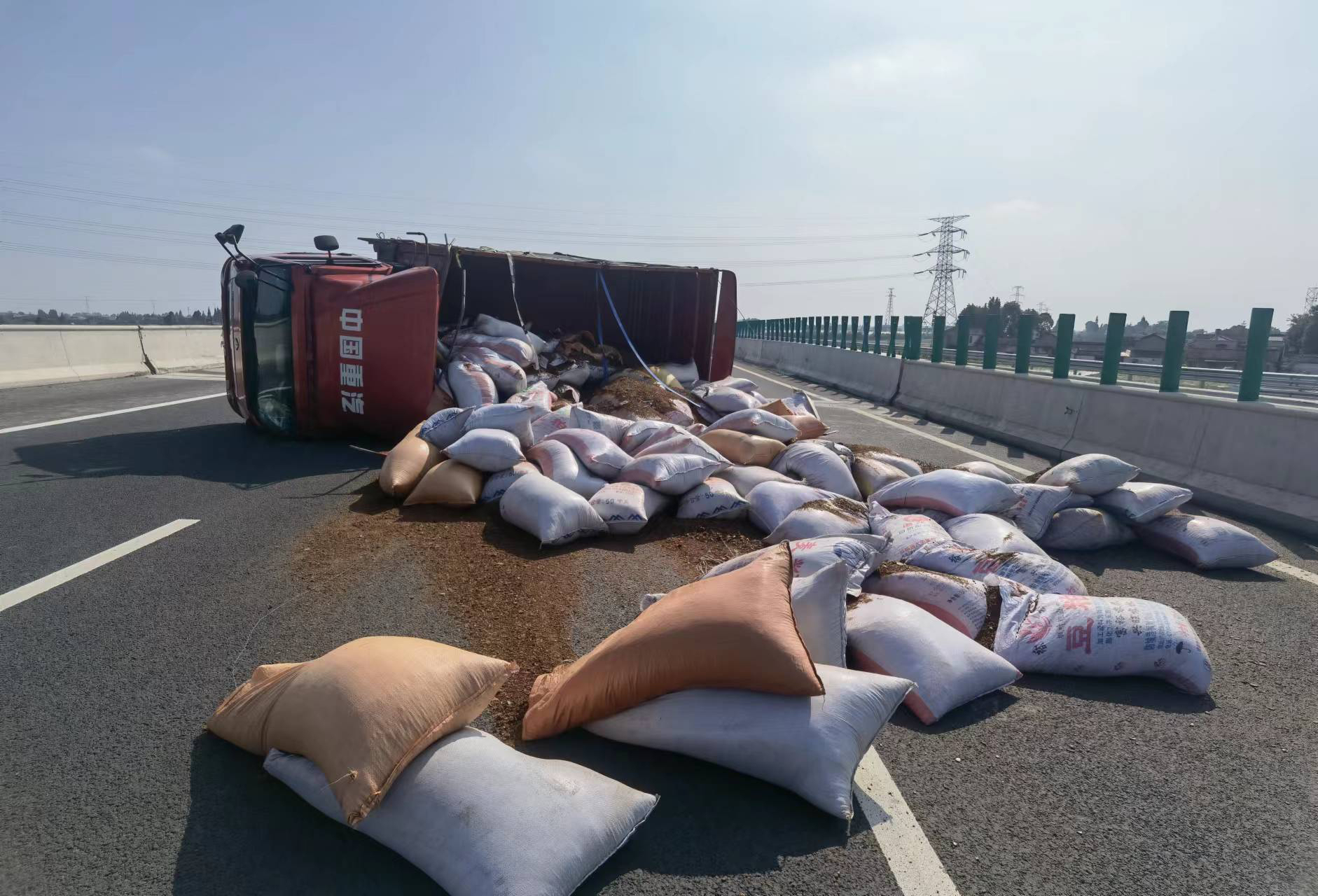 5月28日15时40分许,一辆川B牌照的小货车行驶至成都第三绕城高速德都段K10公里附近处时不慎发生侧翻,车上满载的菜油渣散落一地,车辆和货物占据了三条车道,严重影响后方车辆通行。