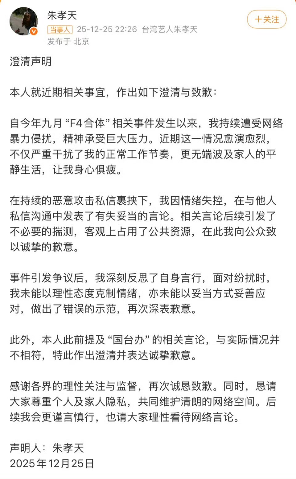12月25日晚,朱孝天发布澄清声明,回应网传私信截图争议,表示自己因遭受持续恶意攻击,情绪失控下发表了不当言论,为此深刻反思并致歉。之前,网传朱孝天爆料五月天公司相信音乐利用黄牛把票价炒高,这些话如同投入平静湖面的巨石,激起千层浪。