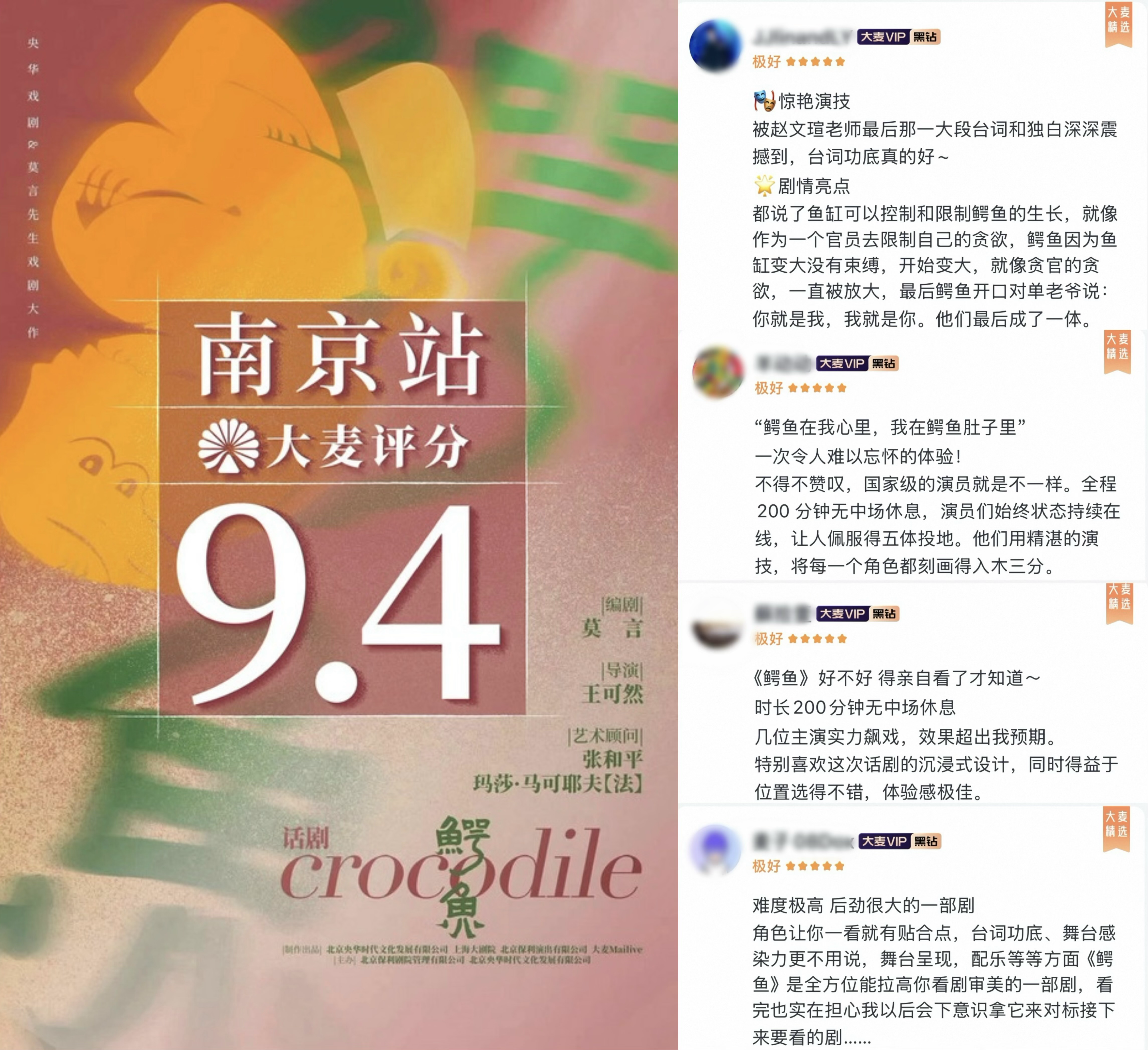 话剧《鳄鱼》自2024年5月3日首演至今,已先后展开两轮巡演,走过20余座城市,演出场次超50场,大麦平台观众评分达9.4分,被广泛赞誉“是国内少有的将现实主义内核与魔幻舞台表现完美结合的舞台剧作品,思想性和艺术性都非常高”。