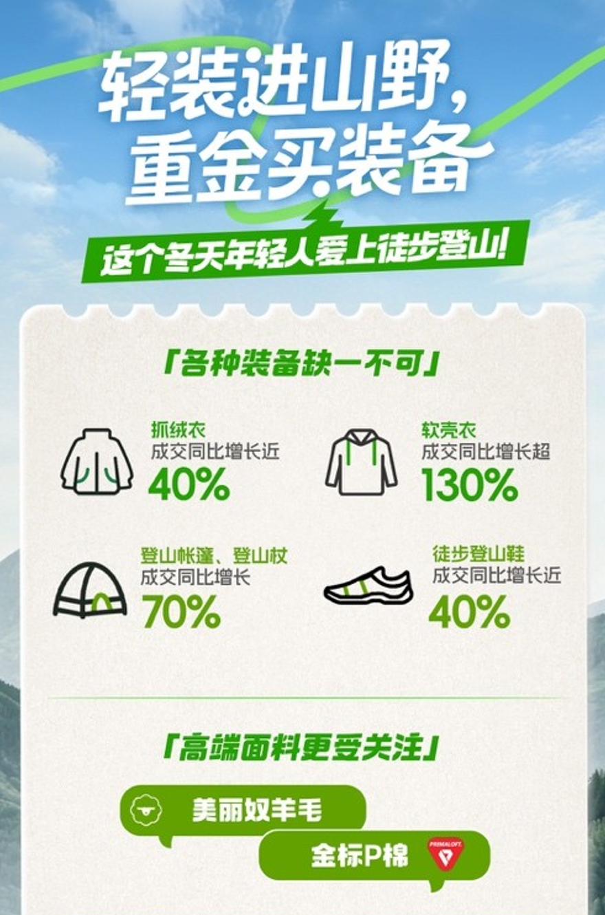 12月以来,平台上登山帐篷、登山杖成交同比增长70%,徒步登山鞋成交同比增长近40%,同时带动全品类户外服饰热销,功能内衣成交同比增长近30%,抓绒衣成交同比增长近40%,保暖棉衣成交同比增长近80%,软壳衣成交同比增长超130%,“美丽奴羊毛”、“金标P棉”等户外徒步登山服饰高端面料,搜索量同比增长超100%。