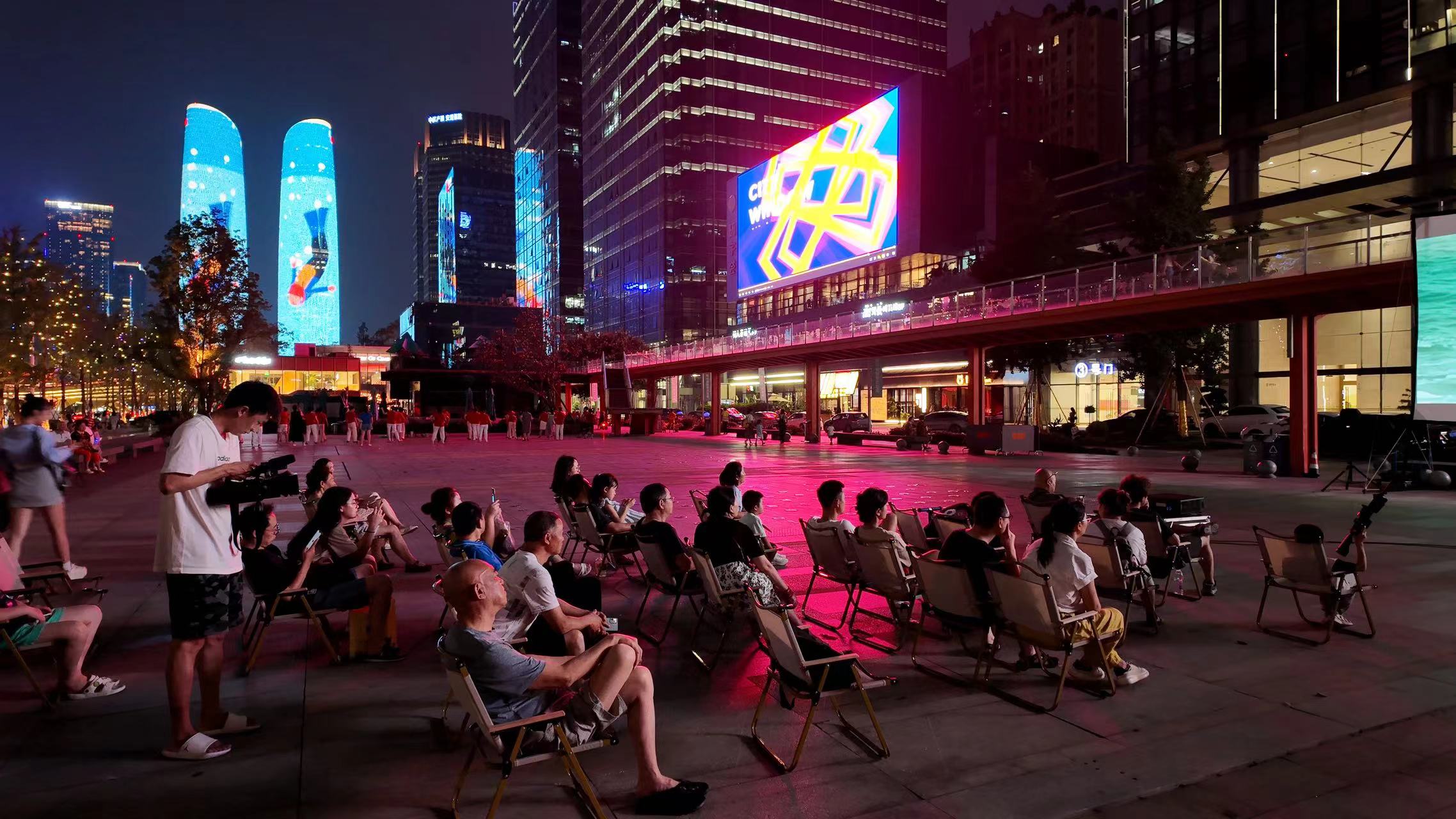 7月19日晚8点,交子大道的“星空电影院”准时放映。不同于儿时露天电影的是,如今露天电影的背景变成了璀璨闪耀的双子塔和欣欣向荣的城市之夜。在交子大道city walk和观看灯光秀拍照打卡的市民和游客都可以在这里停留,褪去白天的疲惫,静静享受属于城市的光影之夜。