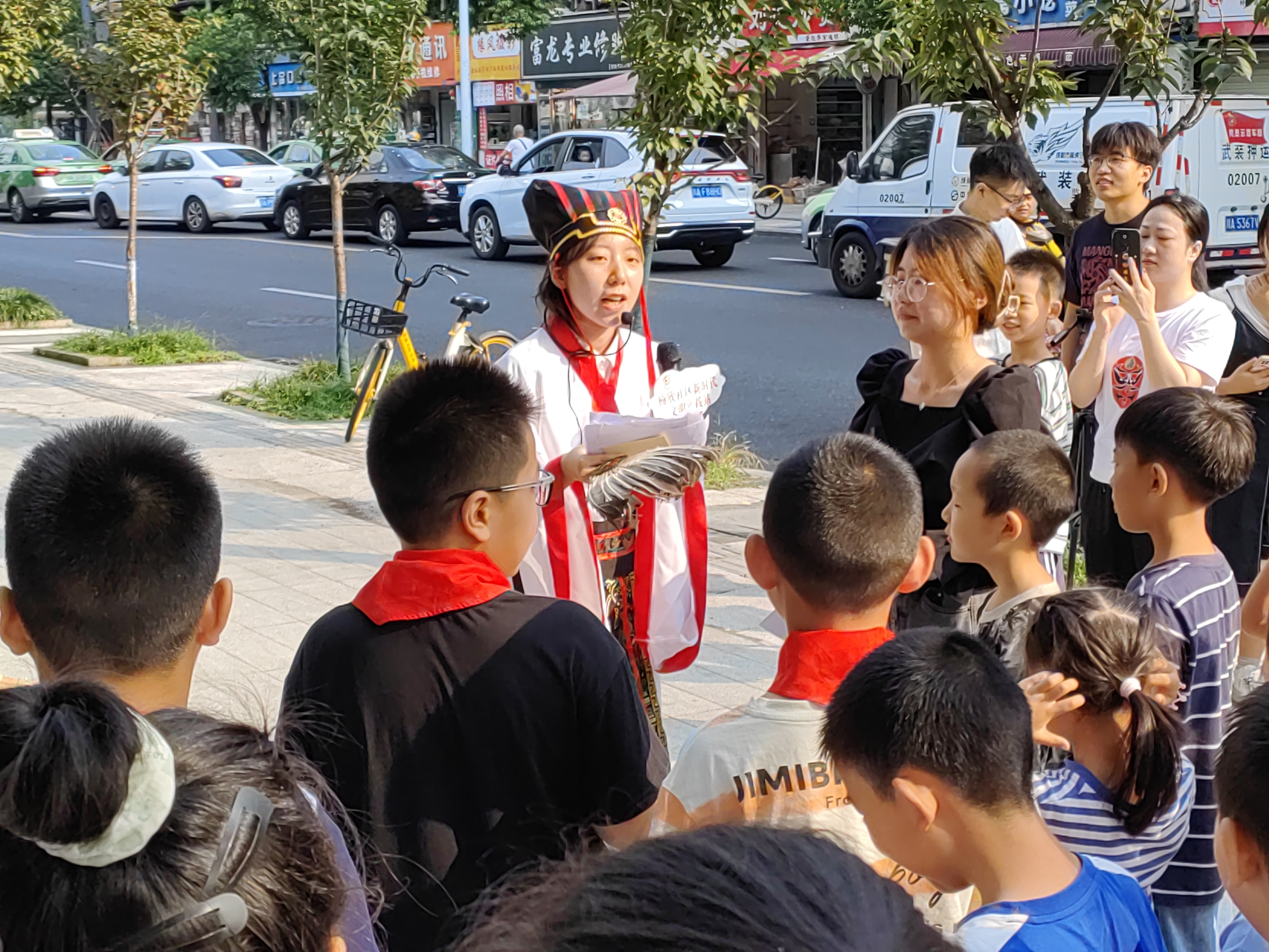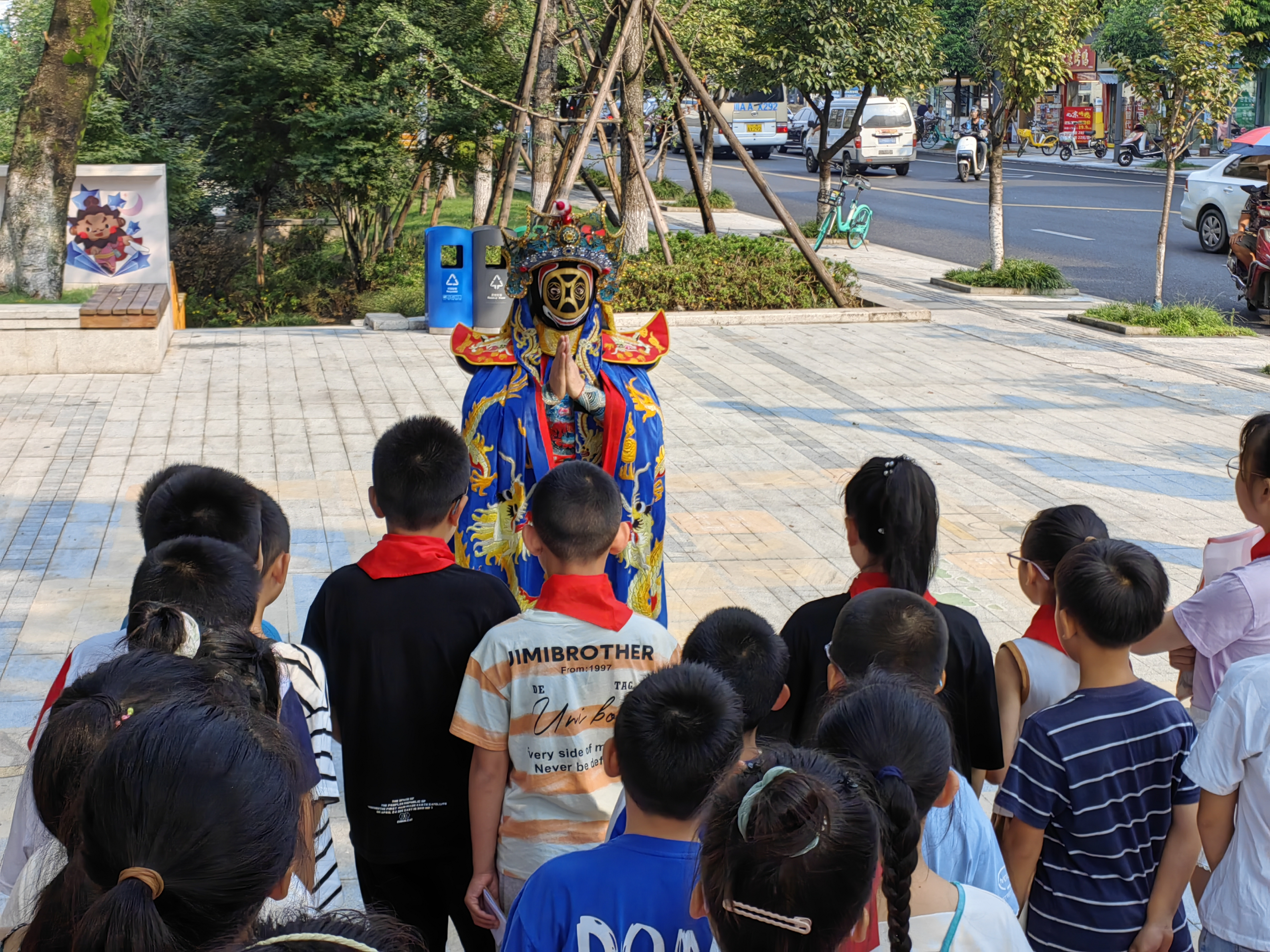 游学活动从楠欣社区三国主题文化小广场出发,非遗文化传承人刘昌伟在芙蓉门带来的川剧变脸精彩演绎。随后,现场讲解员带领游学家庭一起在棋盘游戏中“穿越”对话正在书写《诫子书》的诸葛亮,学习了解《诫子书》中的三国家风文化。