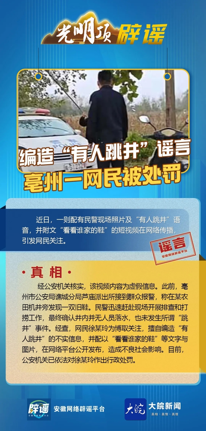 编造“有人跳井”谣言 安徽亳州一网民被处罚 安徽网络辟谣平台 2025-12-01 17:32 58892 来源:安徽网络辟谣平台 评论 3 周三哥 2025-12-01 发表于四川 严肃处理造谣者 周三哥 2025-12-01 发表于四川 不信谣不传谣 孙小姐 2025-12-01 发表于四川 内心空虚的人就喜欢造谣传谣,找存在感博眼球。对待这样的人应该严惩不贷[围观] 我要评论
