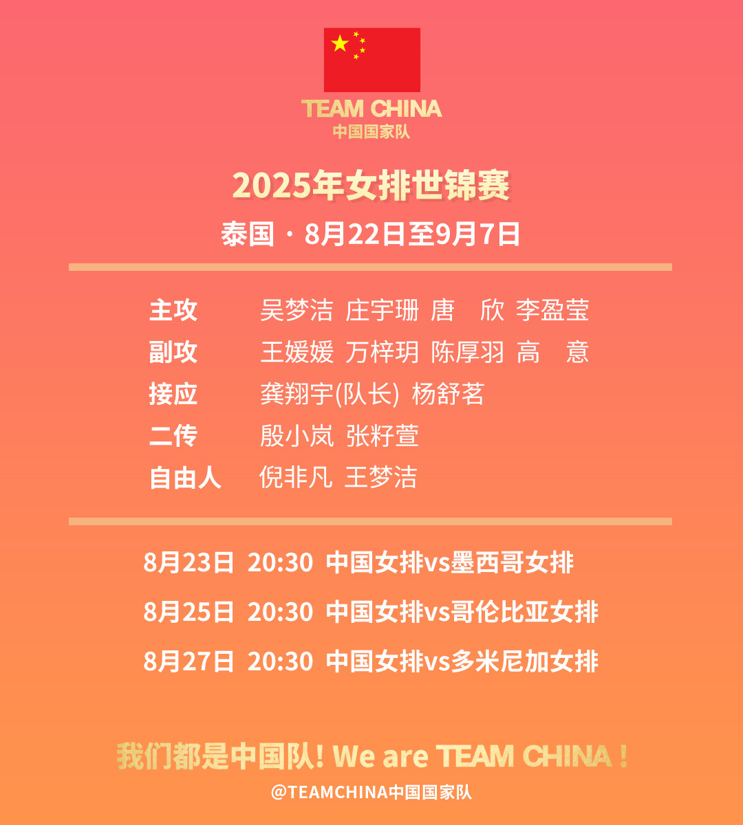 2025年女排世锦赛将于北京时间8月22日至9月7日在泰国举行。