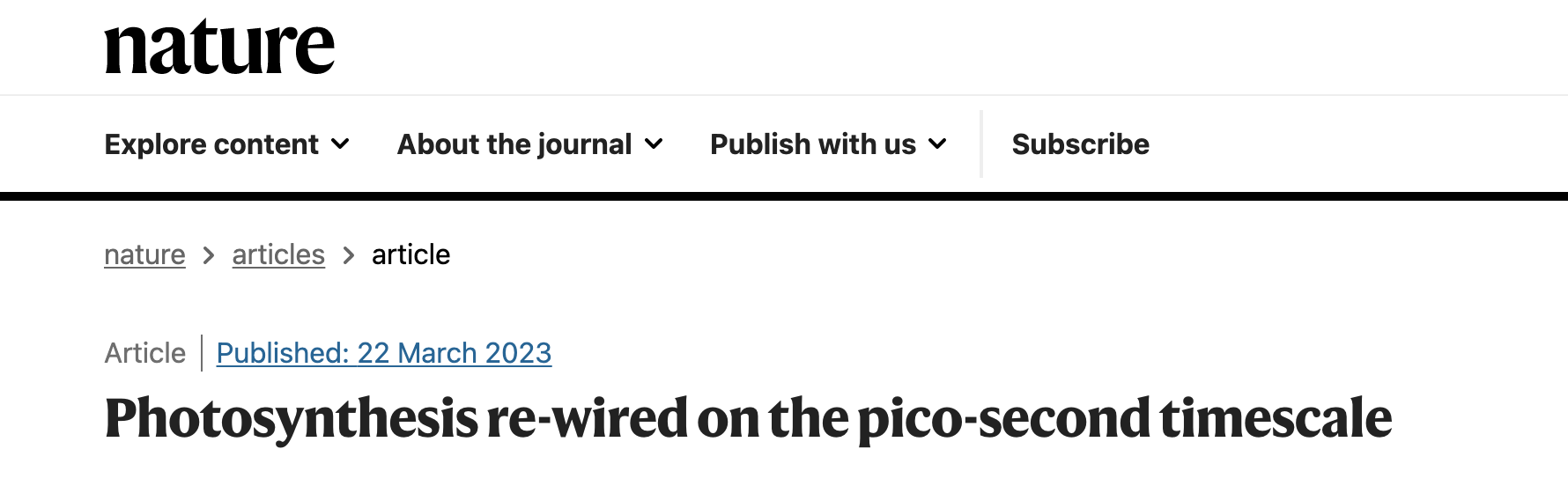 该团队发表在《自然》杂志上的文章《光合作用在皮秒时间尺度上重新连接》。