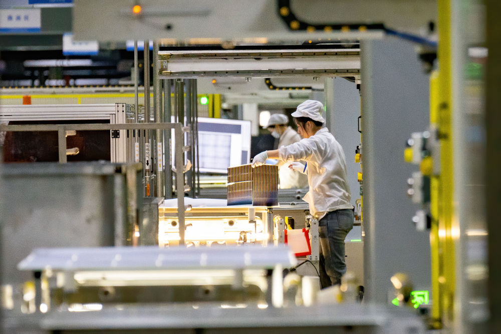 2025年2月13日,在位于安徽省合肥市肥东县的合肥循环经济示范园内一光伏组件企业车间,工人在生产线上忙碌。新华社发(阮雪枫 摄)