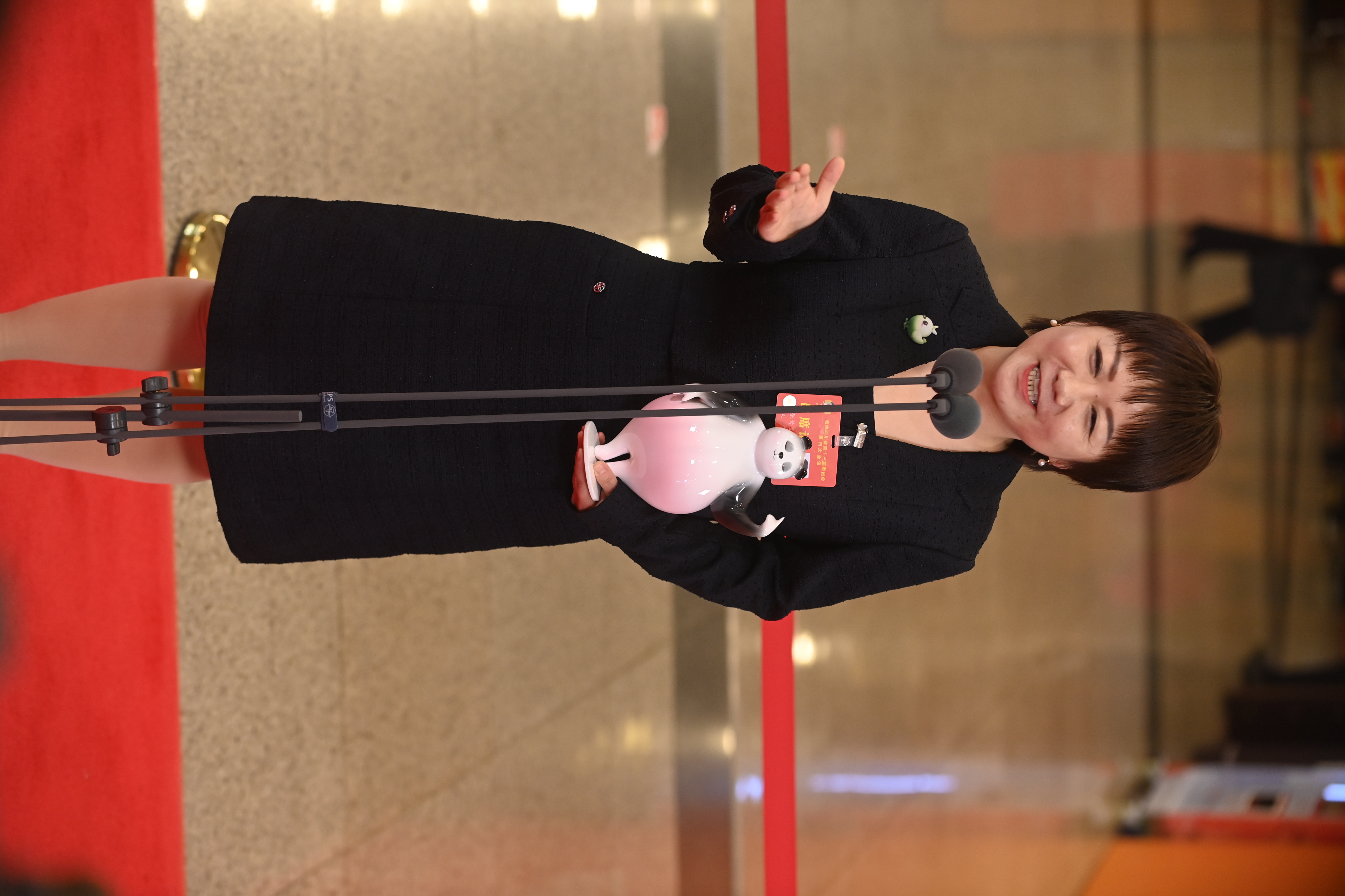 四川省政协委员、成都大学中国—东盟艺术学院美术与设计学院院长张鸶鸶,带着她的答案和两个特别的“小伙伴”走上通道。