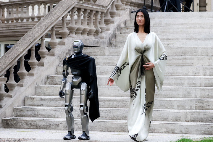 3月26日,上海新天地秀场。人形机器人走起“猫步”自带气势。近期多个品牌发布秀上,机器人或走上T台,或进行创意展示,为时装发布增添浓浓科技味。