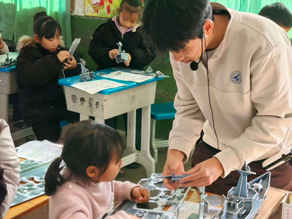 西北工业大学大学生志愿者带领孩子们制作航模。(西北工业大学供图)