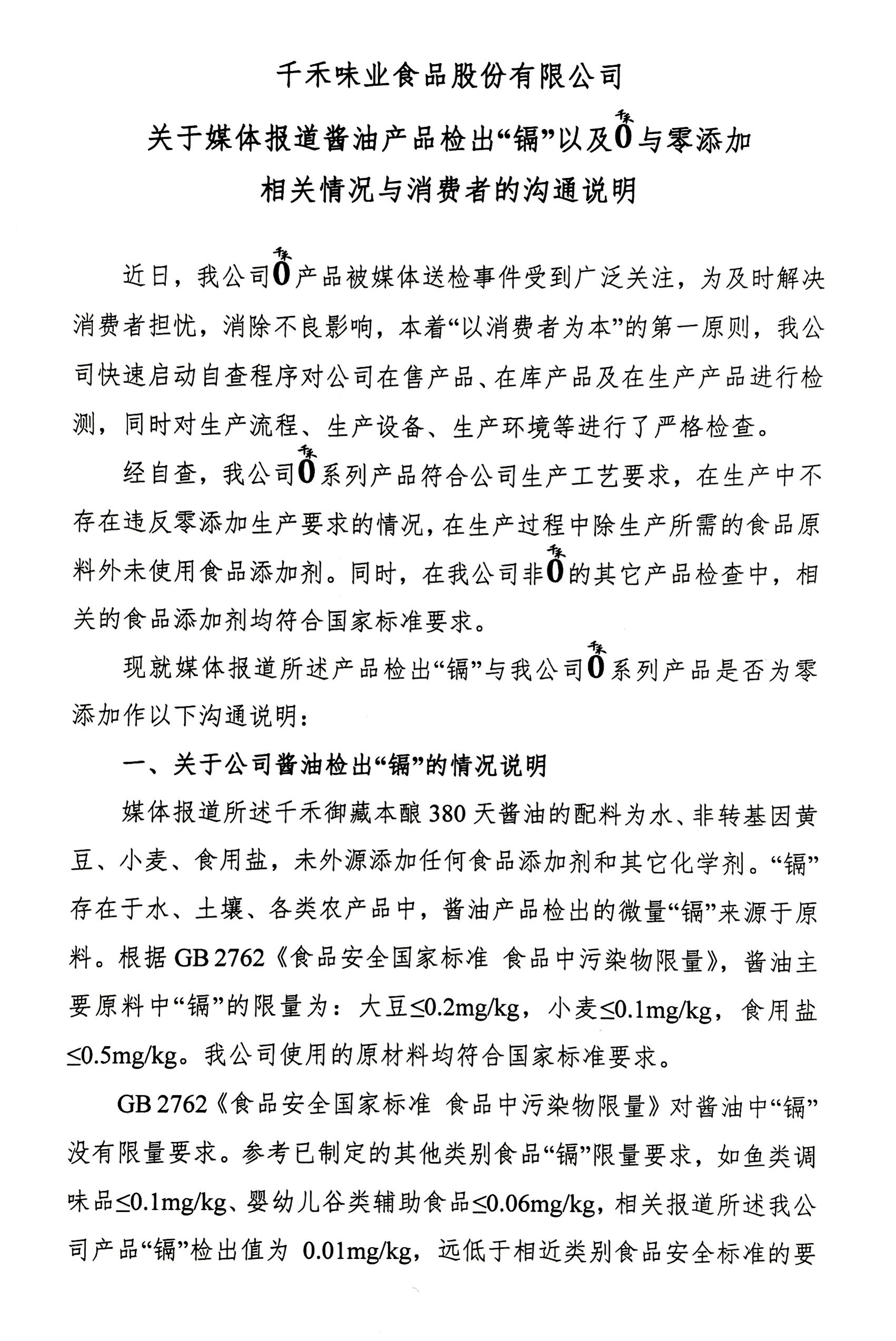 对于报道所述产品检出“镉”的问题,声明表示,“镉”存在于水、土壤、各类农产品中,酱油产品检出的微量“镉”来源于原料。根据GB2762《食品安全国家标准食品中污染物限量》,酱油主要原料中“镉”的限量为:大豆≤0.2mg/kg,小麦≤0.1mg/kg,食用盐≤0.5mg/kg。报道所述产品“镉”检出值为0.01mg/kg,“公司使用的原材料均符合国家标准要求。”