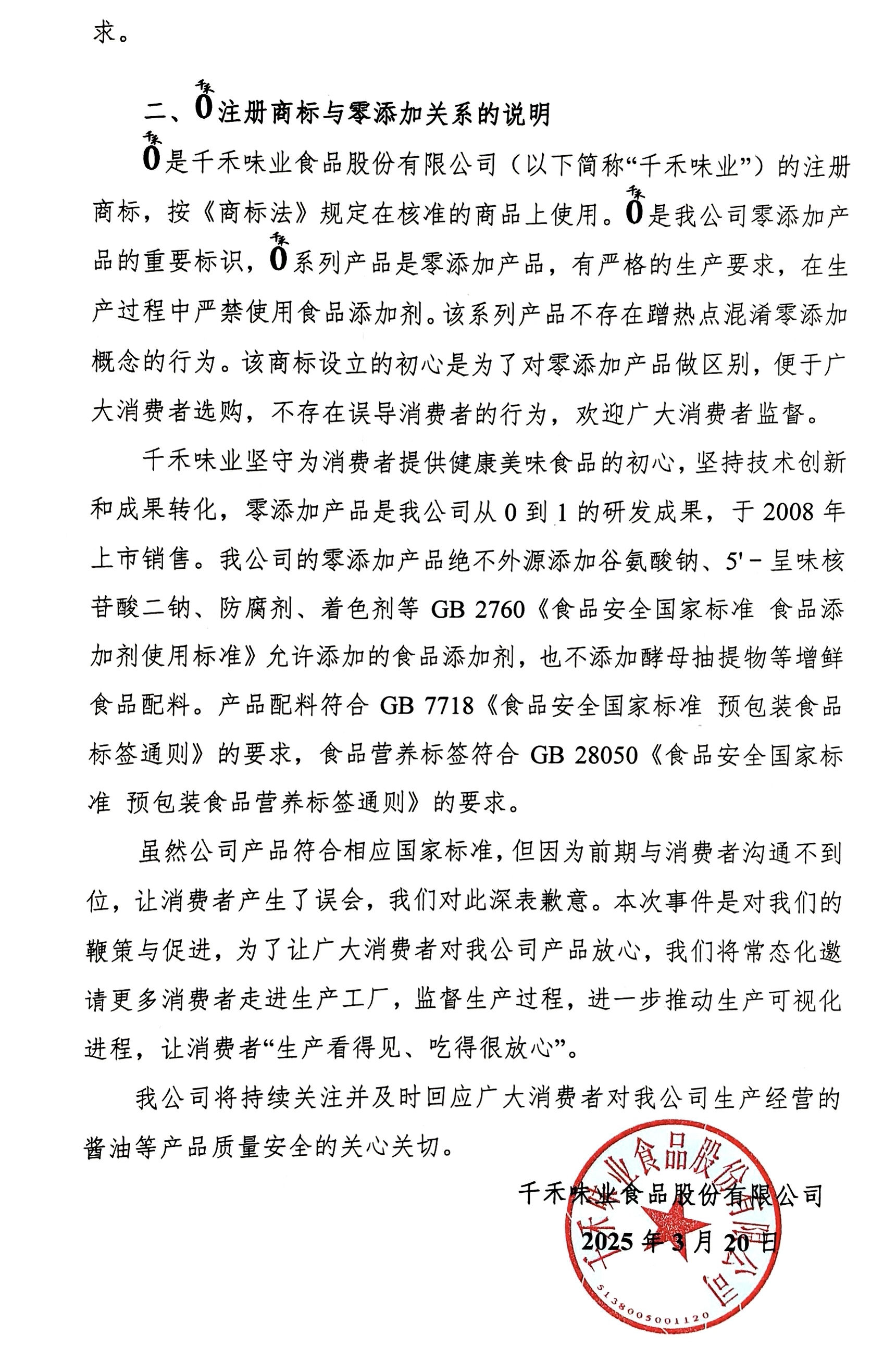 千禾称,“千禾0”图案是公司零添加产品的重要标识,0系列产品是零添加产品,有严格的生产要求,在生产过程中严禁使用食品添加剂。“该系列产品不存在蹭热点混淆零添加概念的行为。”