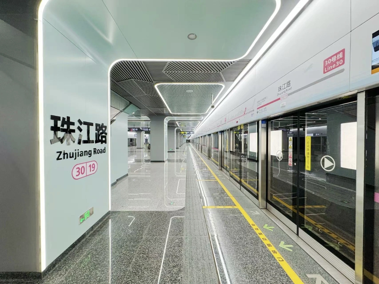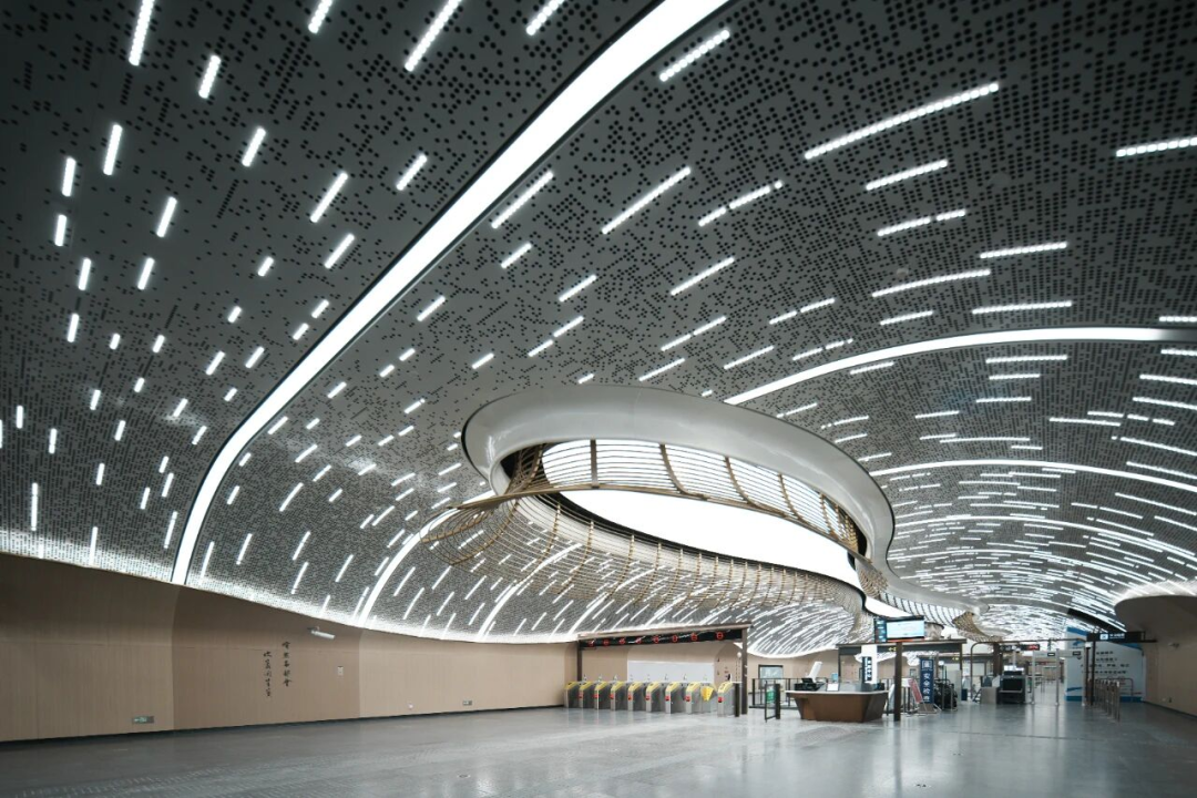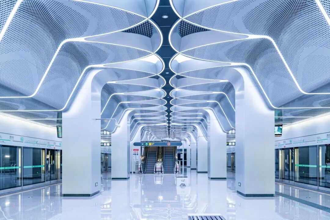 珠江路站围绕“穿越之门”的设计理念,利用张力十足的线条灯光,巧妙划分空间层次,远远看去两侧灯箱仿佛巨大的“时空之眼”踏上未来之旅。