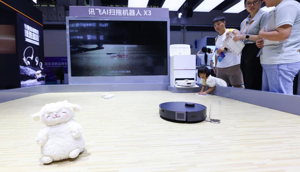 在1号馆数字和服务消费展区,科大讯飞股份有限公司一款“说哪到哪”“指哪扫哪”的AI扫拖机器人引来众多客商驻足。该产品在行进过程中遇到液体污渍会自动倒车清扫、先拖后扫。