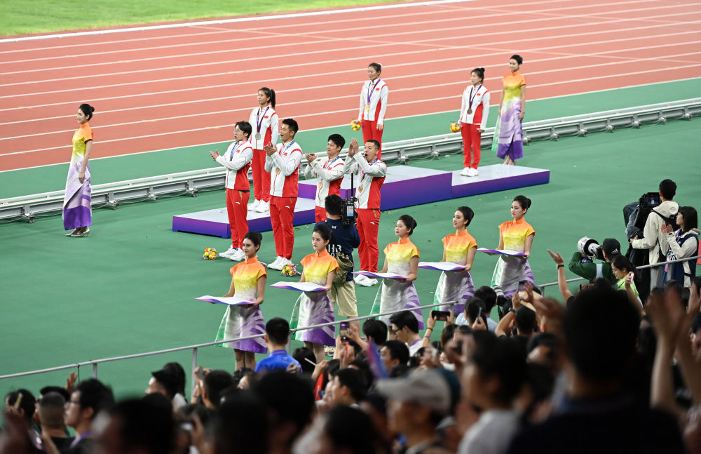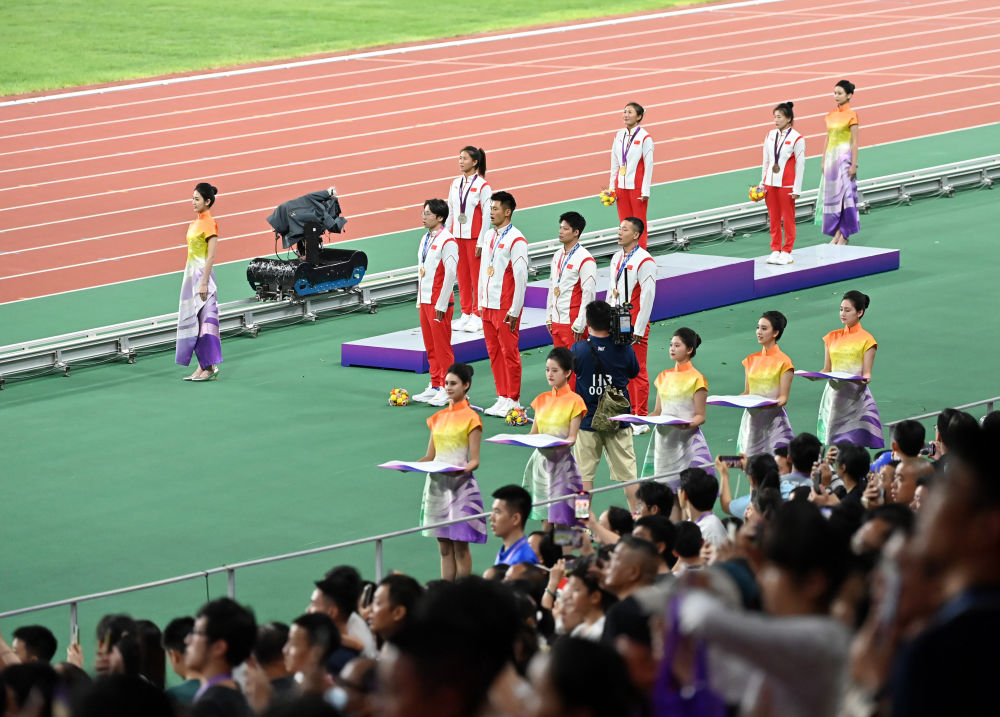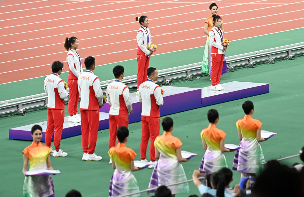 10月4日,杭州亚运会田径项目比赛结束后,中国奥委会在杭州奥体中心体育场举行递补奥运奖牌颁奖仪式,为递补获得东京奥运会男子4X100米接力铜牌的苏炳添、谢震业、吴智强和汤星强与递补获得2012年伦敦奥运会女子20公里竞走金、银、铜牌的切阳什姐、刘虹、吕秀芝颁发奖牌。