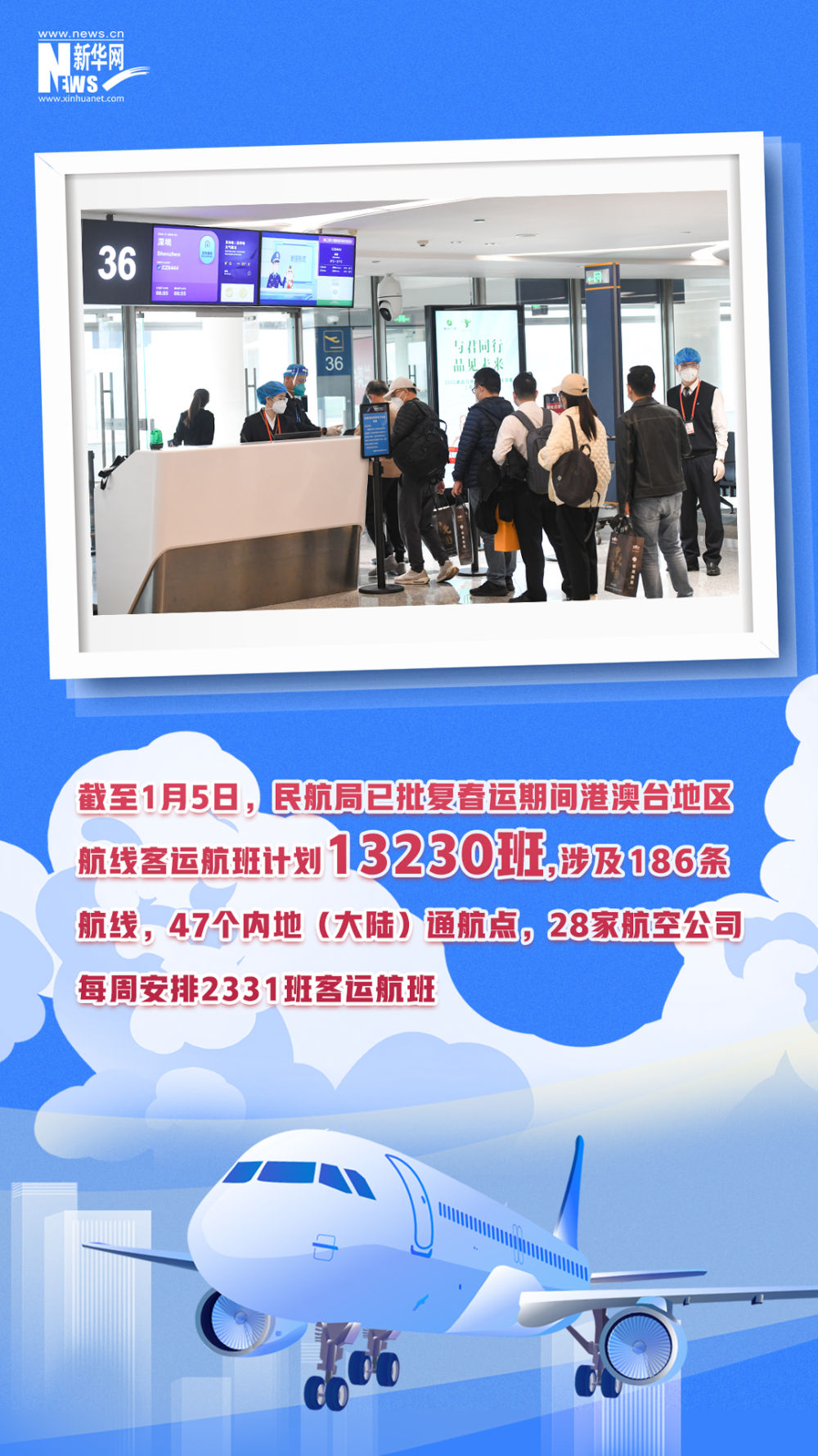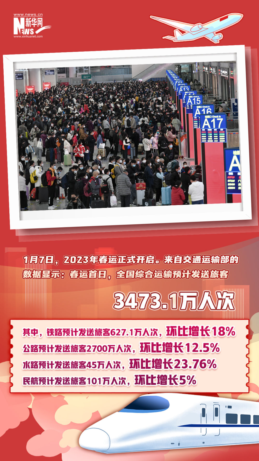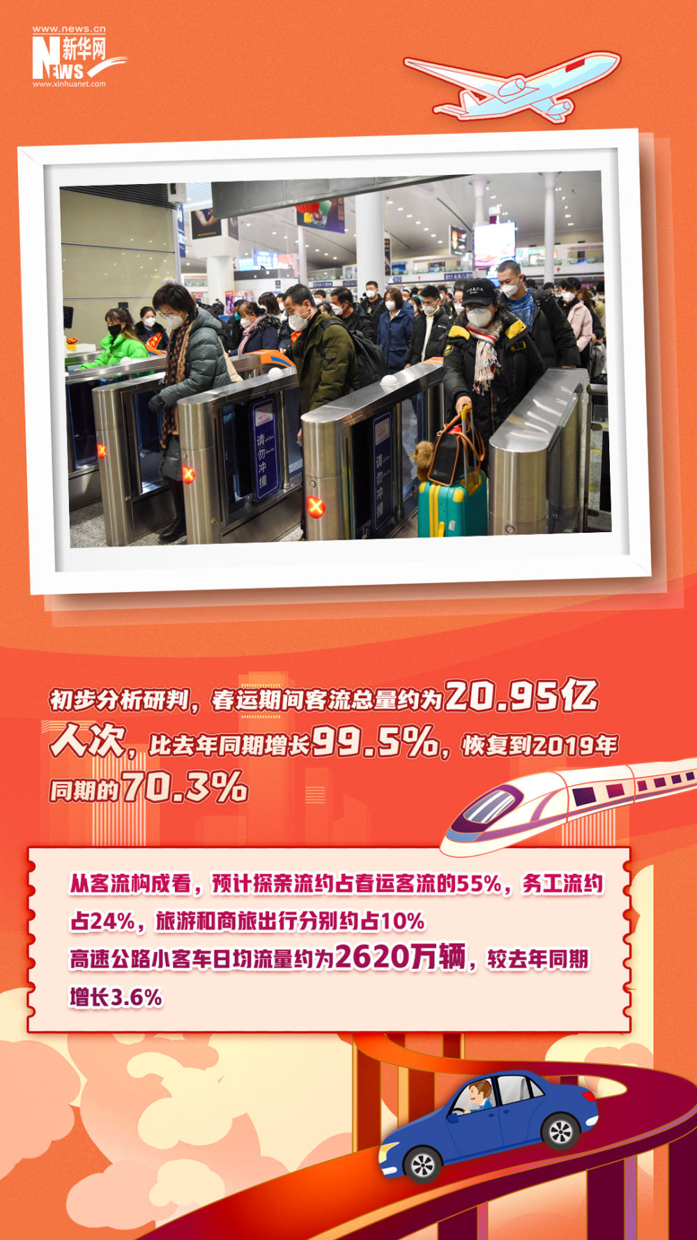 2023年春运已开启。初步分析研判,今年春运期间客流总量约为20.95亿人次,比去年同期增长99.5%,恢复到2019年同期的70.3%。当前,各地的车站、机场人头攒动,人们拎着大包小包,满怀期待踏上旅程。一组数字带你体验流动的中国活力。
