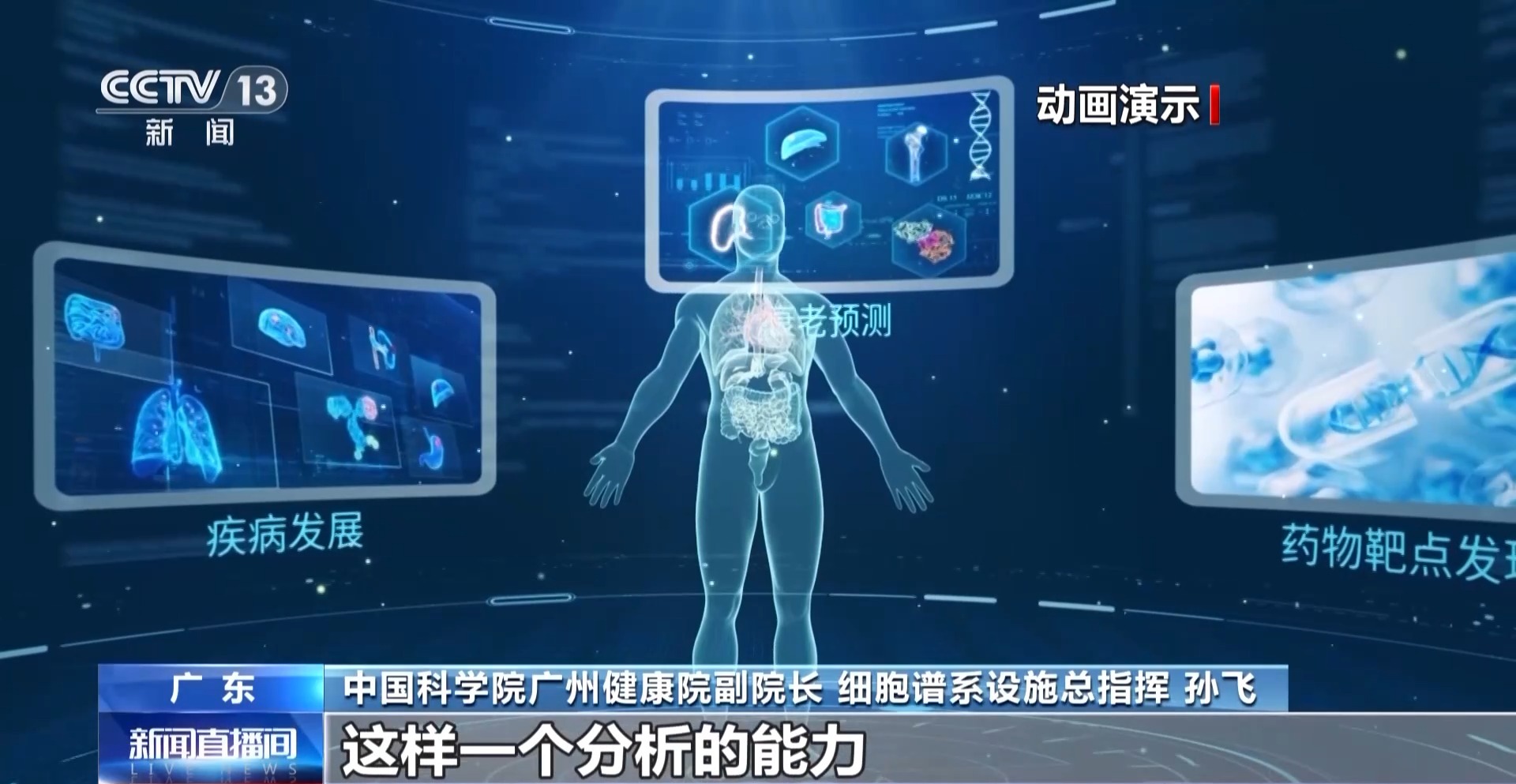 中国科学院广州健康院副院长、细胞谱系设施总指挥 孙飞:我们可以对“数字生理人”让它生病,我们叫作生“数字病”,同时也可以去吃“数字药”,来达到我们新的药物靶点的发现和药理的分析,我们都可以在这样一个数字空间里面来完成,来加速我们生物医药开发的进程。