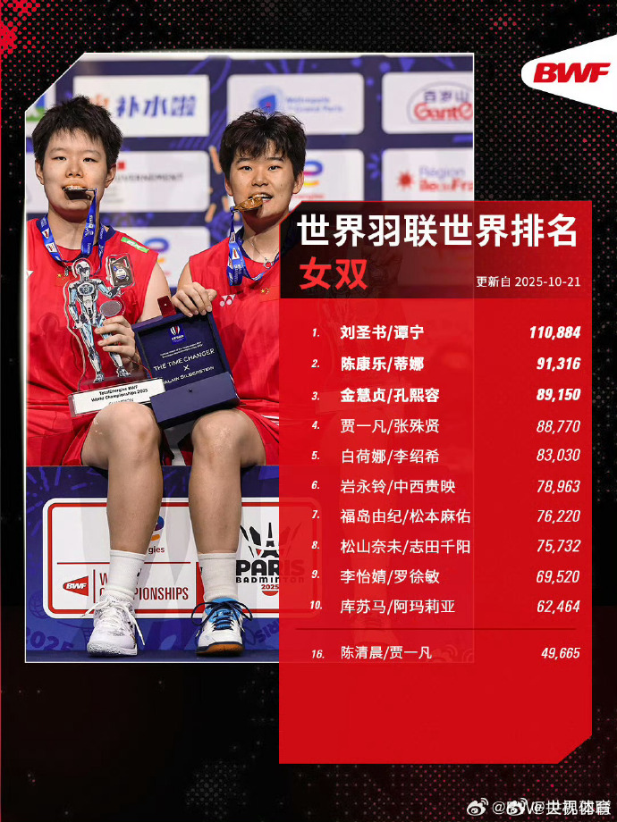 世界羽联最新世界排名揭晓 中国队包揽三项世界第一 央视体育 2025-10-22 13:35 114756 世界羽联2025年第43周世界排名揭晓,中国队强势包揽三项世界第一:石宇奇(男单)、刘圣书/谭宁(女双)、蒋振邦/魏雅欣(混双)均以10万+高分继续领跑各单项第一。 评论 7 fm1066571 2025-10-23 发表于四川 加油 fmeeb32d 2025-10-22 发表于辽宁 支持 易水寒llll 2025-10-22 发表于四川 点赞!祝福!致敬!赞赞赞!世界羽联最新世界排名揭晓 中国队包揽三项世界第一! 查看更多